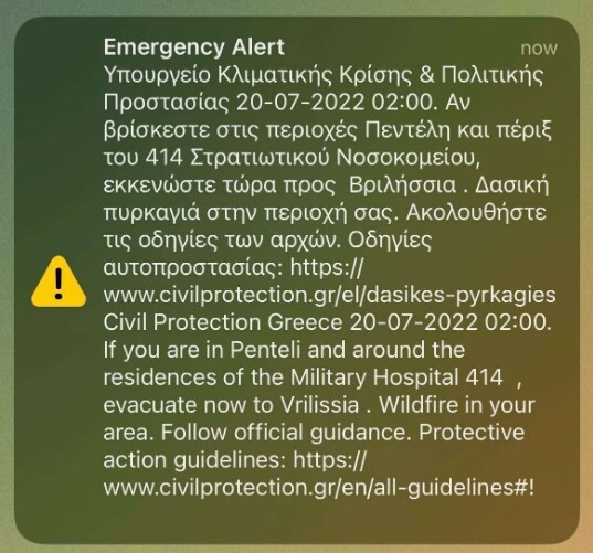 Στις 2 τη νύχτα, το 112 έστειλε μήνυμα: «Αν βρίσκεστε στις περιοχές Πεντέλη και πέριξ του 414 Στρατιωτικού Νοσοκομείου, εκκενώστε προς Βριλήσσια».