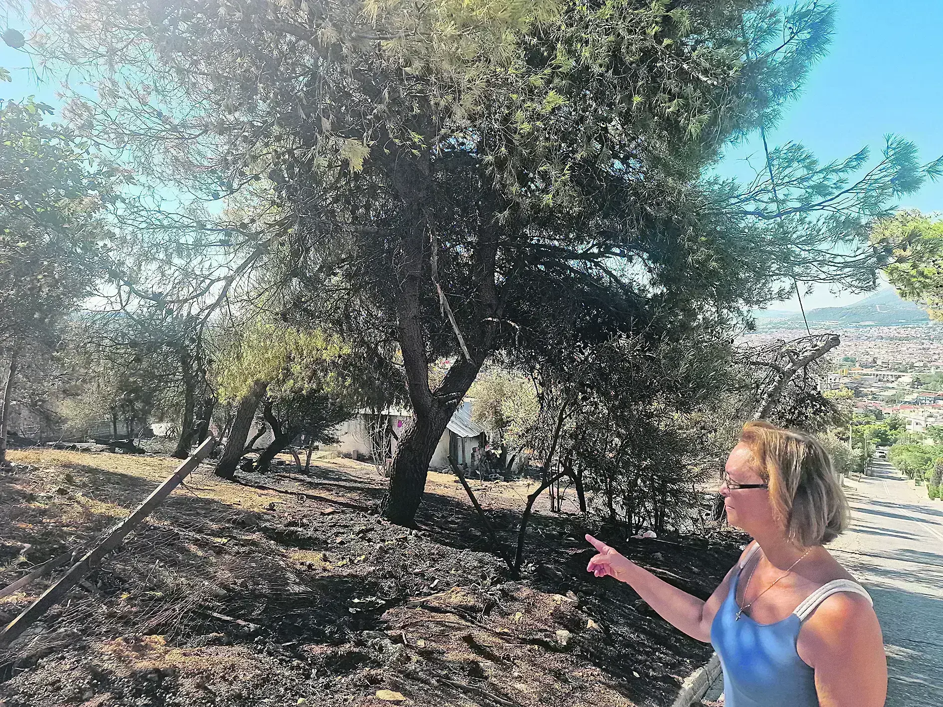 Εκεί συναντάμε την κ. Ιωάννα Γουλανδρή, που μας ανοίγει το σπίτι της και μας οδηγεί στο μπαλκόνι, για να μας δείξει ότι τα πεύκα εφάπτονται με το σπίτι της. Ενα από αυτά, μάλιστα, έχει σπάσει από παλιά κακοκαιρία, αλλά τα ξερά κλαδιά του ακουμπάνε στο μπροστινό μπαλκόνι. «Οταν πλησίασε η φωτιά, λάβαμε μήνυμα από το “112” να εκκενώσουμε την περιοχή. Φύγαμε με τον σύζυγό μου και μείναμε δύο μέρες σε συγγενικό σπίτι στο Χαλάνδρι, καθώς, όταν πέρασε η φωτιά, δεν είχαμε ρεύμα και νερό», λέει η κ. Γουλανδρή και συνεχίζει: «Η φορά του ανέμου πήγε τη φωτιά προς το Πάτημα Χαλανδρίου, αλλιώς κι εδώ θα καιγόμασταν. Υπάρχουν αυτά τα τεράστια πεύκα πάνω στα σπίτια, που δεν μπορούμε να τα πειράξουμε. Αυτό το ξερό είναι εδώ πολύ καιρό. Εχουμε ενημερώσει τον δήμο, αλλά δεν ενδιαφέρεται κανείς. Στο πίσω μέρος υπήρχε άλλο ένα πολύ επικίνδυνο πεύκο. Μαζέψαμε χρήματα όλα τα διαμερίσματα για να πάρουμε ειδική άδεια από την Πολεοδομία που κόστισε 100 ευρώ και άλλα 500 πήρε το συνεργείο που το έκοψε».
