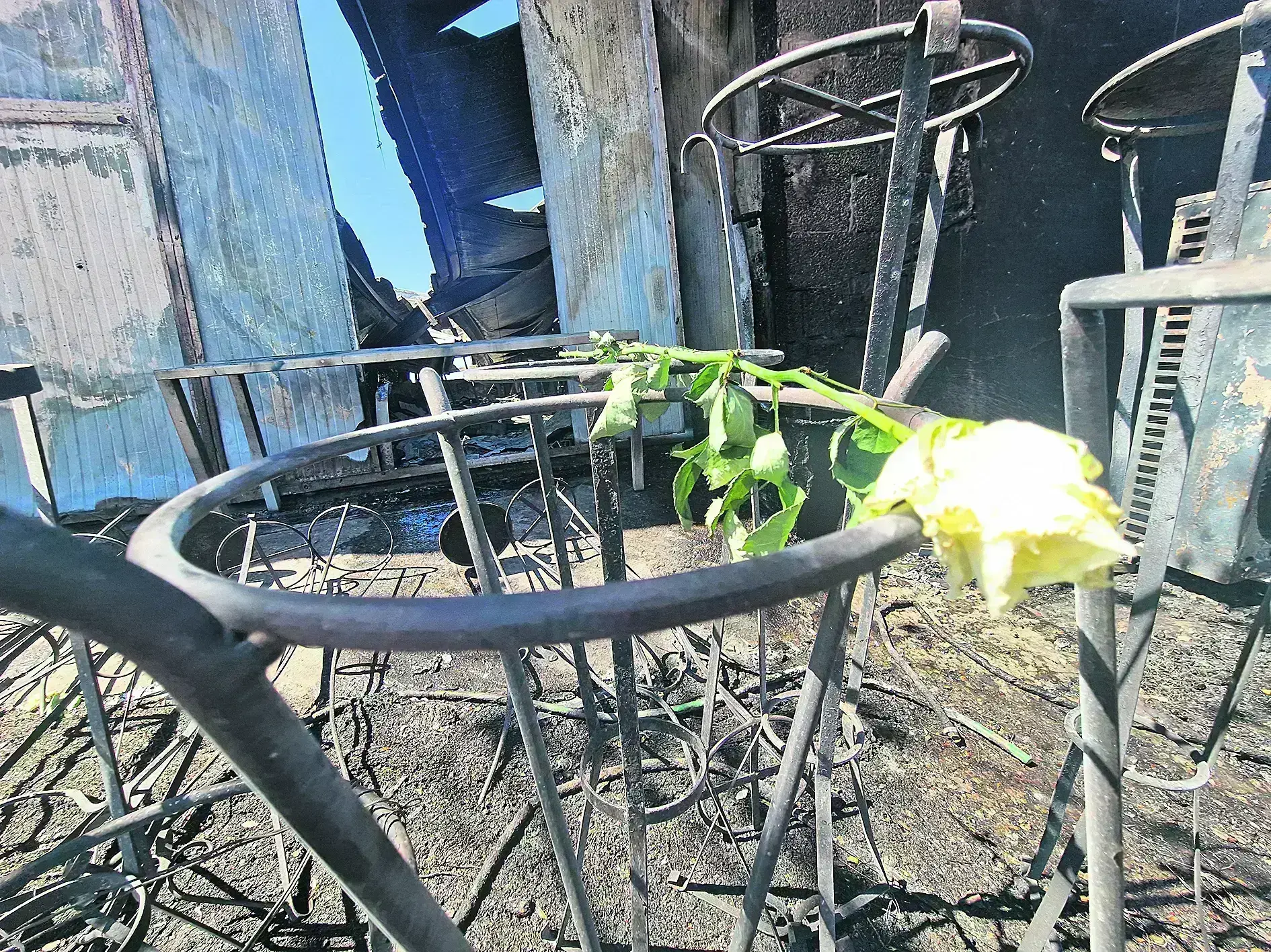 Στο εσωτερικό διακρίνονται μόνο τσαλακωμένες λαμαρίνες και απ’ έξω ένα μηχανάκι έχει σχεδόν εξαϋλωθεί από τη μανία της φωτιάς. Σκόρπια ξερά λουλούδια και βάσεις από κασπό ανθοστολισμού δείχνουν ότι πριν από λίγα 24ωρα εδώ δούλευαν άνθρωποι, όπως η άτυχη γυναίκα που έφτιαχνε στεφάνια και ανθοσυνθέσεις για τελετές. Πάνω σε μια μουντζουρωμένη μεταλλική βάση στην είσοδο, φίλοι της έχουν αφήσει ένα λευκό τριαντάφυλλο στη μνήμη της.