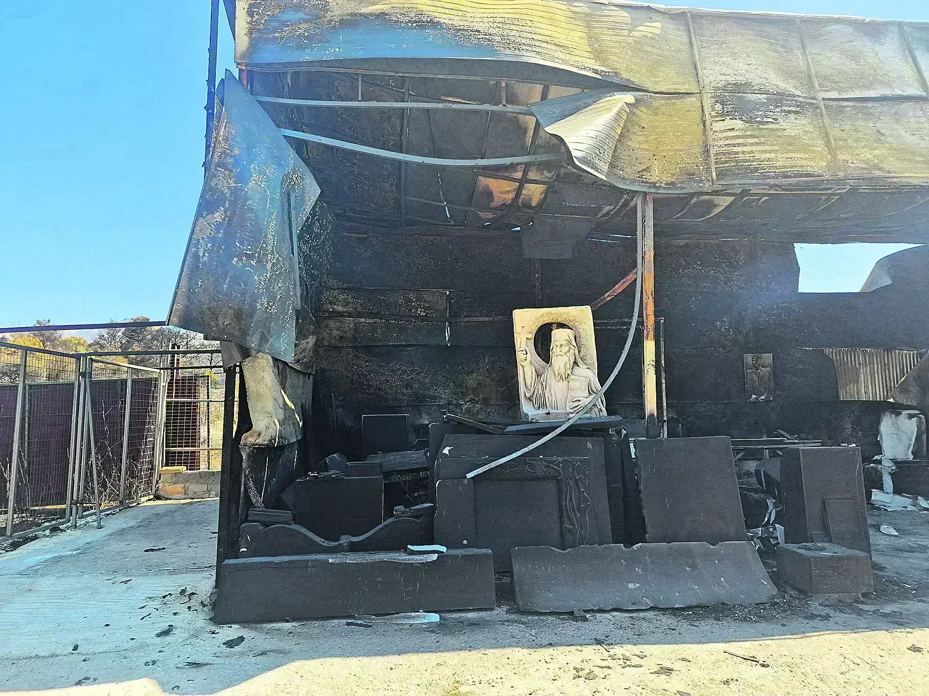 Τριγύρω καμένα σπίτια, αυτοκίνητα και επιχειρήσεις με φόντο το κοιμητήριο συνθέτουν ένα δυστοπικό σκηνικό που κανείς δεν φανταζόταν ότι θα βλέπαμε όταν ξεπήδησαν οι πρώτες φλόγες στον Βαρνάβα την προηγούμενη Κυριακή.
