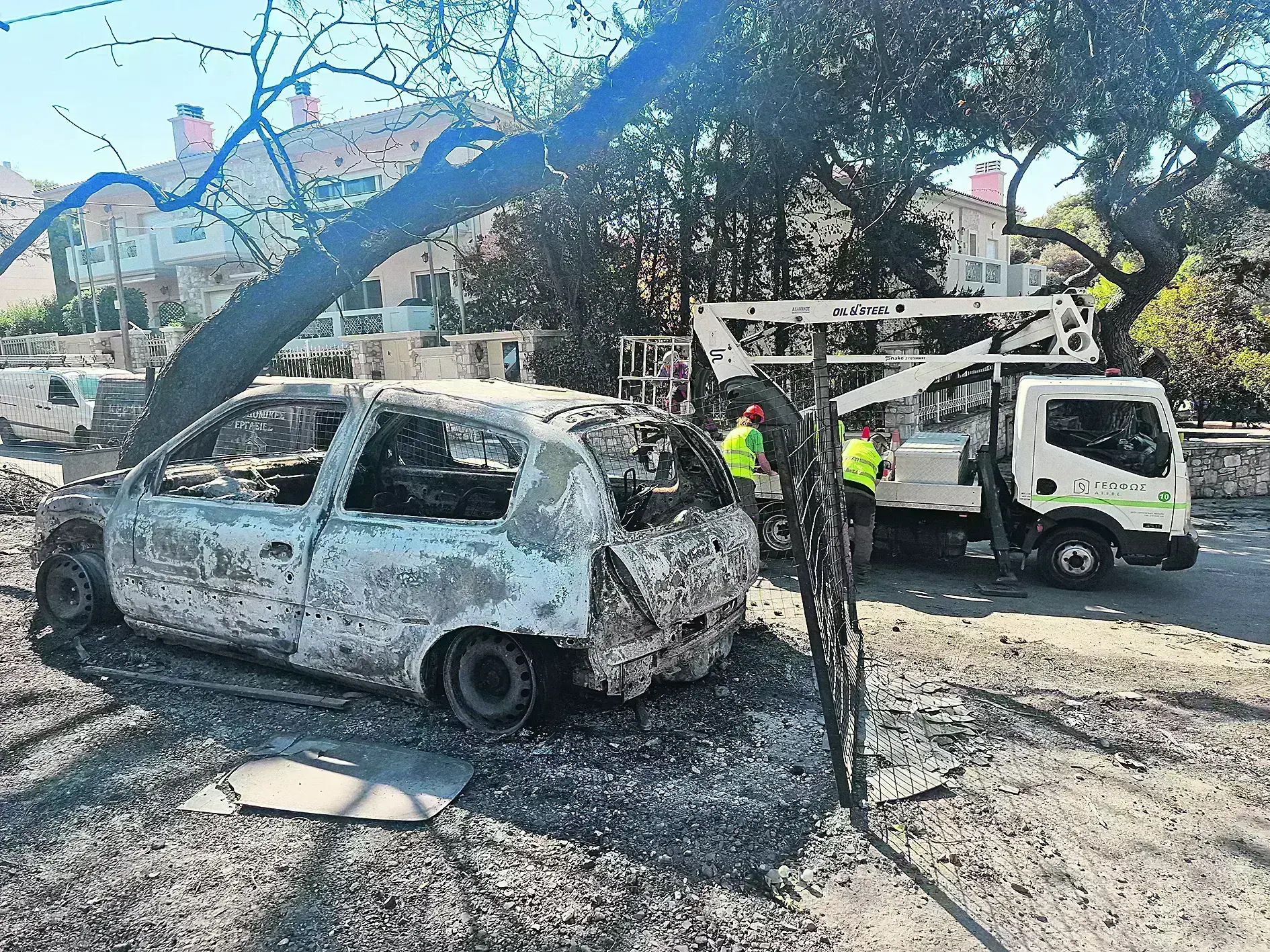 Στον ίδιο δρόμο, η στάση των λεωφορείων αποτυπώνει τη μανία της φωτιάς που έλιωσε και τα σίδερα. Λίγο πιο πέρα, στους κάθετους δρόμους της οδού Αλέκου Παναγούλη ο ανατριχιαστικός ήχος της φωτιάς έχει αντικατασταθεί από τον ήχο του αλυσοπρίονου που κόβει τους καμένους κορμούς. Συνεργεία του ΔΕΔΔΗΕ υπάρχουν παντού προσπαθώντας να αποκαταστήσουν τις εκτεταμένες βλάβες στο δίκτυο ηλεκτροδότησης.