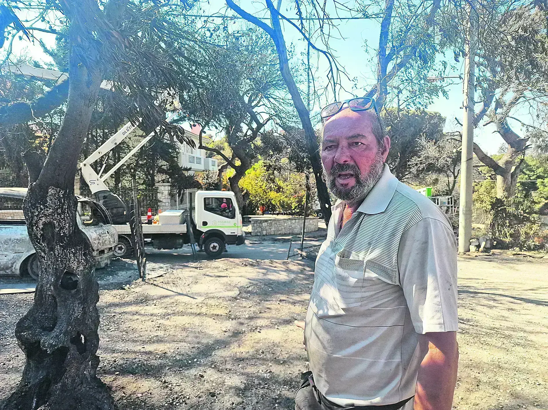 Εδώ συναντάμε τον κ. Τάσο, έναν από τους πολλούς κατοίκους των κατεστραμμένων περιοχών που αγνόησαν τις ειδοποιήσεις για εκκένωση και έμειναν πίσω να σώσουν τις περιουσίες τους. Ενώ τα πάντα γύρω είναι καμένα, το σπίτι του στέκεται ανέπαφο, με την ελληνική σημαία να κυματίζει στο μπαλκόνι. Η μαρτυρία του είναι χαρακτηριστική του πύρινου ολέθρου. «Εδώ γεννήθηκα εγώ, αλλά και η μάνα μου και η γιαγιά μου. Δεν μπορούσα να αφήσω το σπίτι να καεί», μας λέει και συνεχίζει τη διήγησή του για τις εφιαλτικές ώρες που έζησε η περιοχή. «Εδιωξα τις γυναίκες και έμεινα μόνος μου. Με ένα λαστιχάκι έσωσα το σπίτι μου, χωρίς καμία βοήθεια. Εδώ δεν ήρθε κανείς, ούτε να μας βοηθήσει να σβήσουμε ούτε να μας πει να φύγουμε από το σπίτι. Το πρωί (σ.σ.: της Δευτέρας), όταν η φωτιά ήταν ακόμα ψηλά, ήρθαν τα ελικόπτερα και τη σταμάτησαν. Στη συνέχεια, όμως, τα ελικόπτερα έφυγαν για τον Διόνυσο και στις 12 το μεσημέρι φούντωσε και μας έκαψε. Μας άφησαν να καούμε», λέει ο κ. Τάσος.