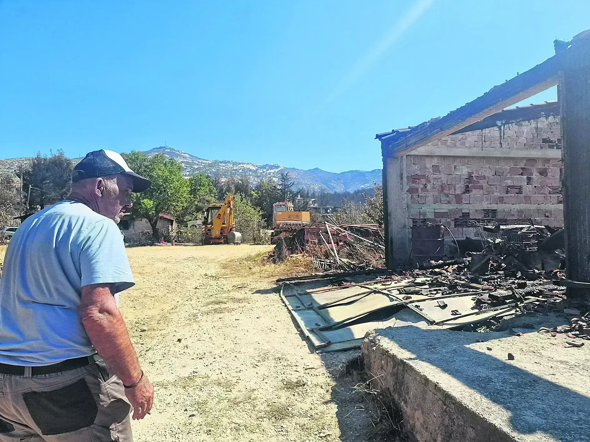 Σε μικρή απόσταση βρίσκεται και η επιχείρησή του, που εκτελεί χωματουργικές εταιρίες. «Επαθα ζημιές, αλλά τουλάχιστον έσωσα τα μηχανήματα», μας λέει. Γύρω του υπάρχουν κουφάρια σπιτιών και αυτοκινήτων που οι ιδιοκτήτες τους δεν κατάφεραν να τα σώσουν.