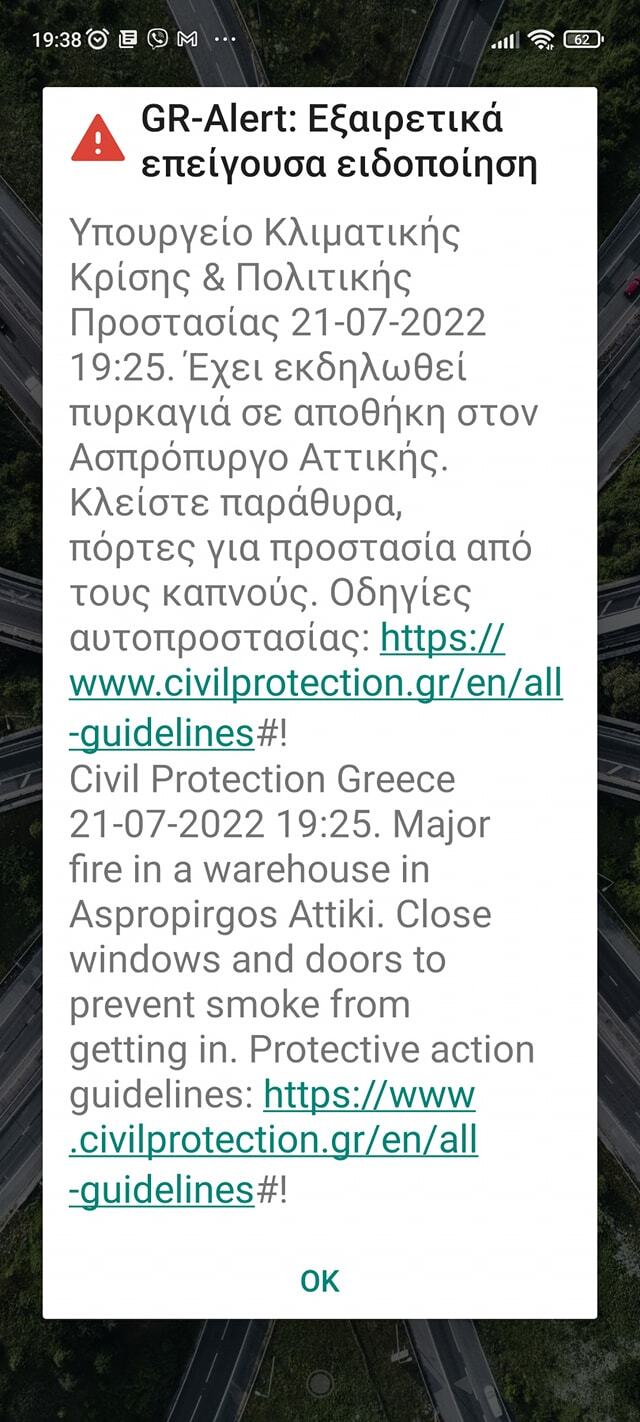 Ενδεικτικό της δύσκολης κατάστασης είναι πως λίγο μετά τις 19.00 το απόγευμα μήνυμα εστάλη μέσω του 112 στους κατοίκους της περιοχής με οδηγίες προστασίας από τους καπνούς της πυρκαγιάς. «Κλείστε παράθυρα, πόρτες για προστασία από τους καπνούς», αναφέρει το μήνυμα χαρακτηριστικά.