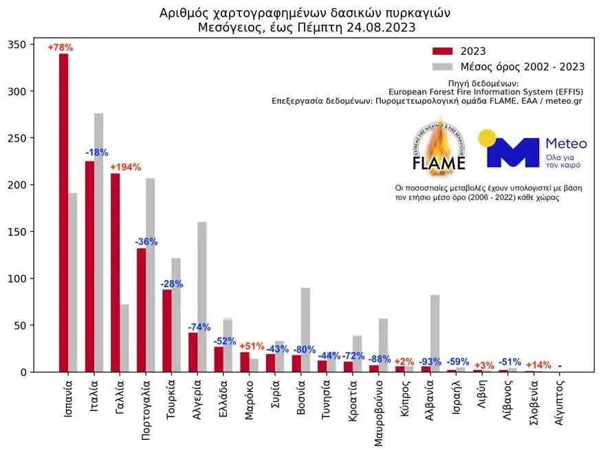Καταγράφοντας 1.281.480 στρέμματα καμένων εκτάσεων έως την Πέμπτη 24.08.2023, η Ελλάδα κατατάσσεται πρώτη μεταξύ 20 Μεσογειακών χωρών. Δεύτερη έρχεται η Ισπανία με 824.640 στρέμματα και τρίτη η Ιταλία με 595.330 στρέμματα. Αύξηση των καμένων εκτάσεων καταγράφουν επίσης η Γαλλία (+66%) και το Μαρόκο (+30%), ενώ μείωση καταγράφεται στις υπόλοιπες χώρες.