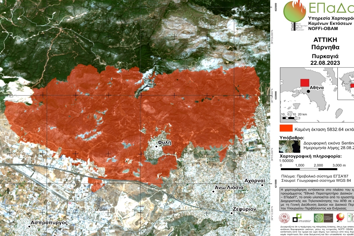 Στους χάρτες φαίνεται ότι οι καμένες εκτάσεις για τις περιοχές του Νομού Έβρου και Πάρνηθας του Νομού Αττικής μέχρι τις 28/08/2023 ανέρχονται στα 82639.63 και 5832.64 εκτάρια αντίστοιχα.