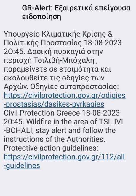 Στο προειδοποιητικό μήνυμα, οι πολίτες καλούνται να παραμείνουν σε ετοιμότητα και να ακολουθούν τις οδηγίες των αρχών.