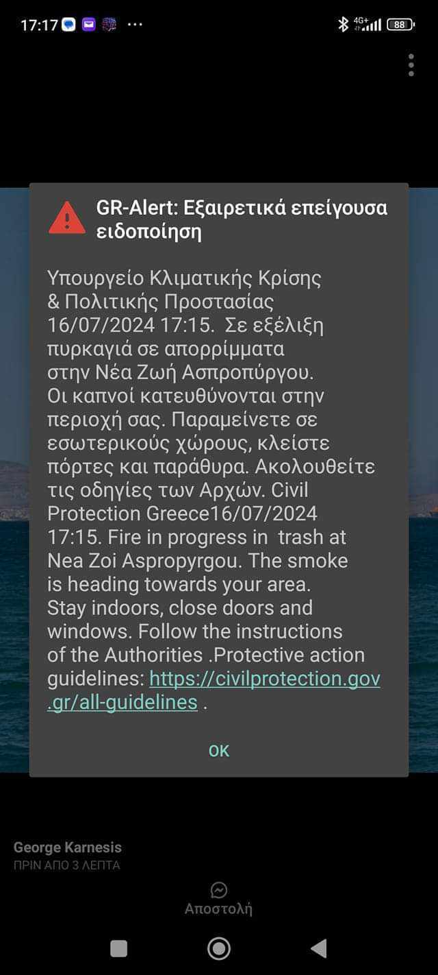 Λόγω της φωτιάς και των πυκνών καπνών, εστάλη 112 σε πολλές περιοχές της Αττικής, προκειμένου οι κάτοικοι να κλείσουν τα παράθυρα και να μην βγαίνουν από τα σπίτια τους μέχρι να καθαρίσει η ατμόσφαιρα.
