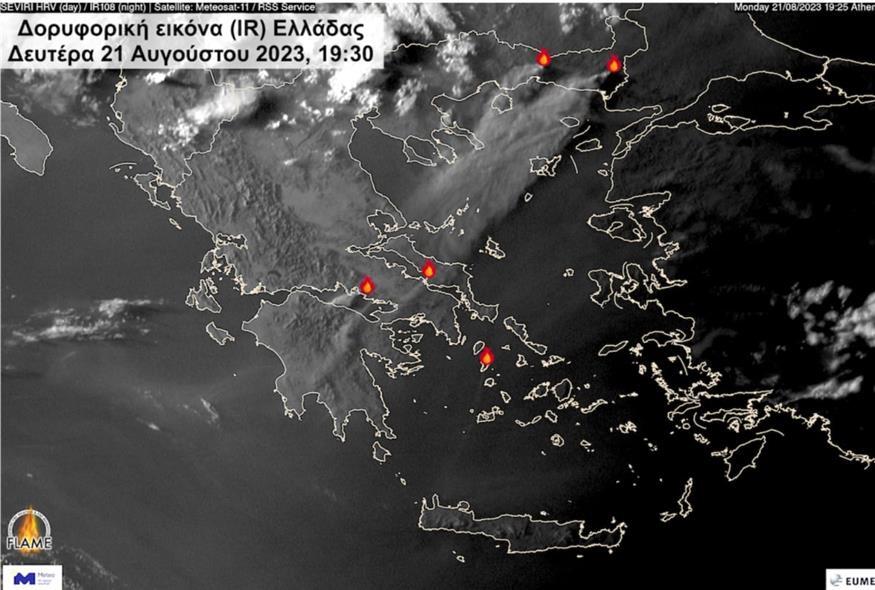 Σε εικόνα του ευρωπαϊκού δορυφόρου METEOSAT-11 αποτυπώνεται η έκταση των δασικών πυρκαγιών που εκδηλώθηκαν νωρίτερα μέσα στη Δευτέρα και παραμένουν ενεργές.