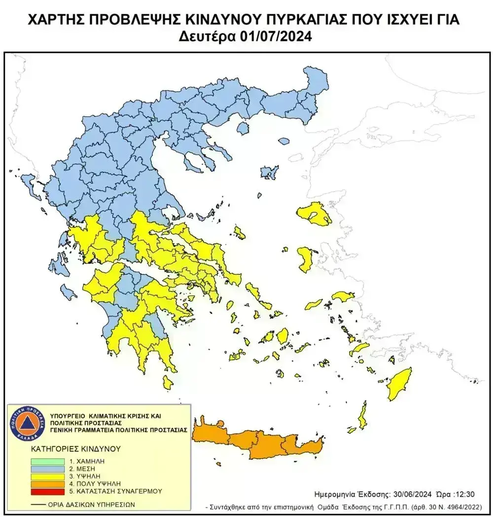 Συγκεκριμένα, προβλέπεται πολύ υψηλός κίνδυνος πυρκαγιάς (κατηγορία κινδύνου 4) για την Κρήτη.