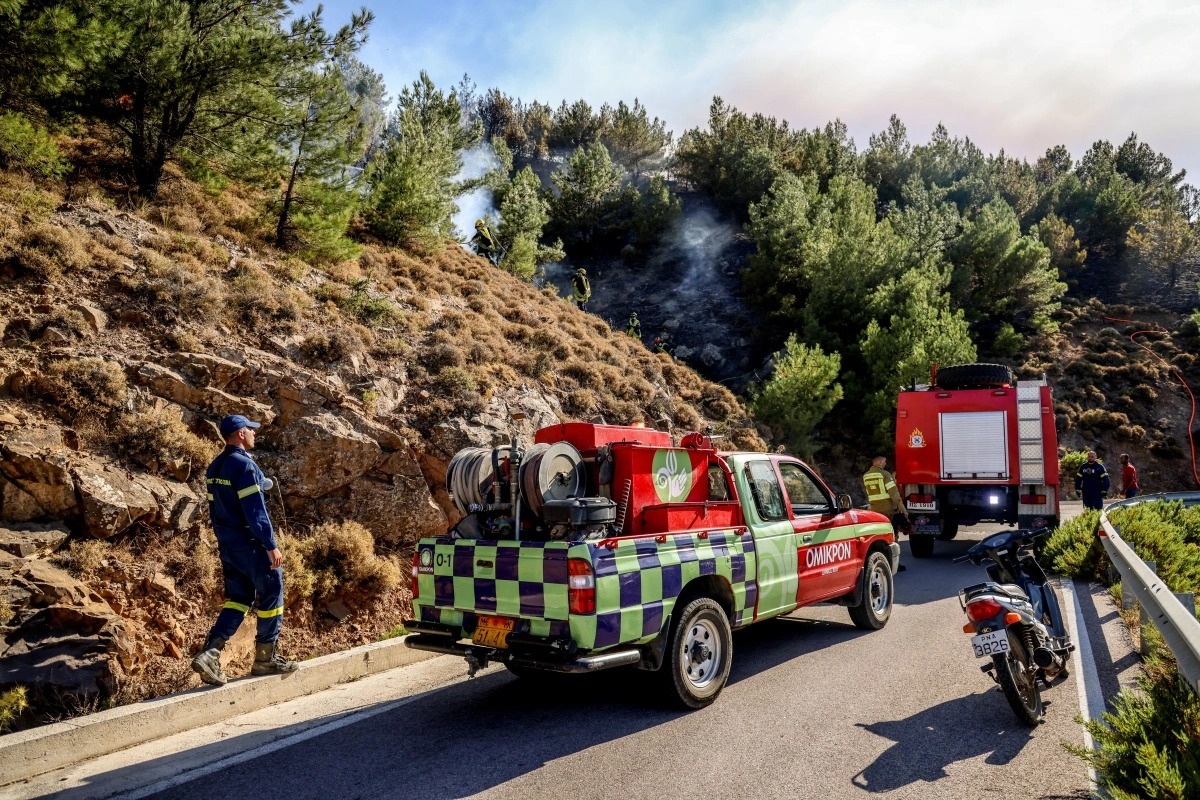 Για την κατάσβεση επιχειρούν 110 πυροσβέστες και δύο πεοζοπόρα, με 36 οχήματα και συνδρομή υδροφόρων ΟΤΑ.