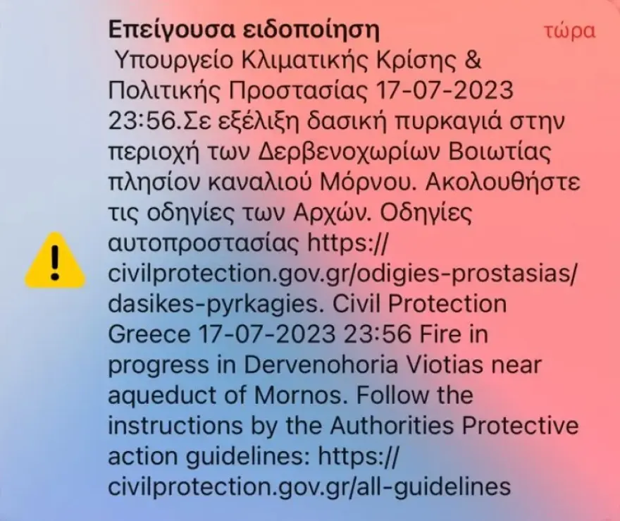 Μετά τα μεσάνυχτα το 112 έστειλε μήνυμα στους κατοίκους της περιοχής τονίζοντας πως υπάρχει σε εξέλιξη δασική πυρκαγιά «στην περιοχή των Δερβενοζωρίων Βοιωτίας πλησίον καναλιού Μόρνου».