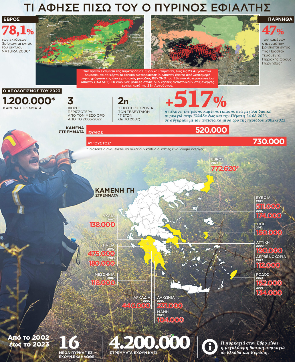 - Κατά τη διάρκεια του Ιουλίου κάηκαν περισσότερα από 520.000 στρέμματα, ενώ κατά τη διάρκεια του Αυγούστου (έως την Τετάρτη 23.08.2023) έχουν καεί περισσότερα από 730.000 στρέμματα.
