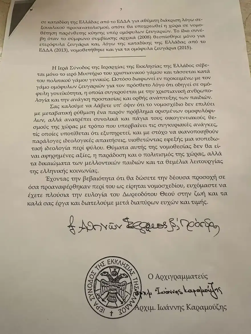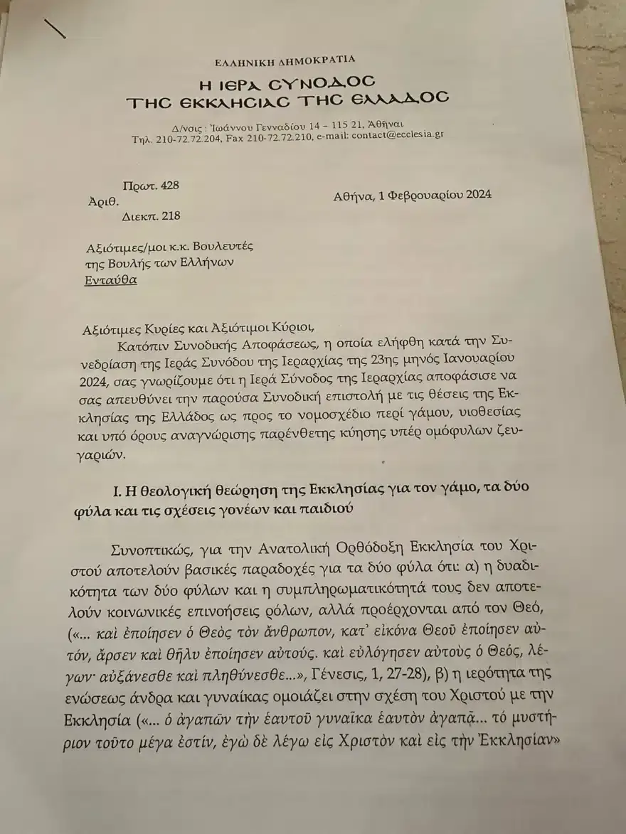 Γάμος ομοφύλων: Αυτή είναι η επιστολή της Ιεράς Συνόδου στους βουλευτές – «Καταργεί μητρότητα και πατρότητα, ουδετεροποιεί τα φύλα»