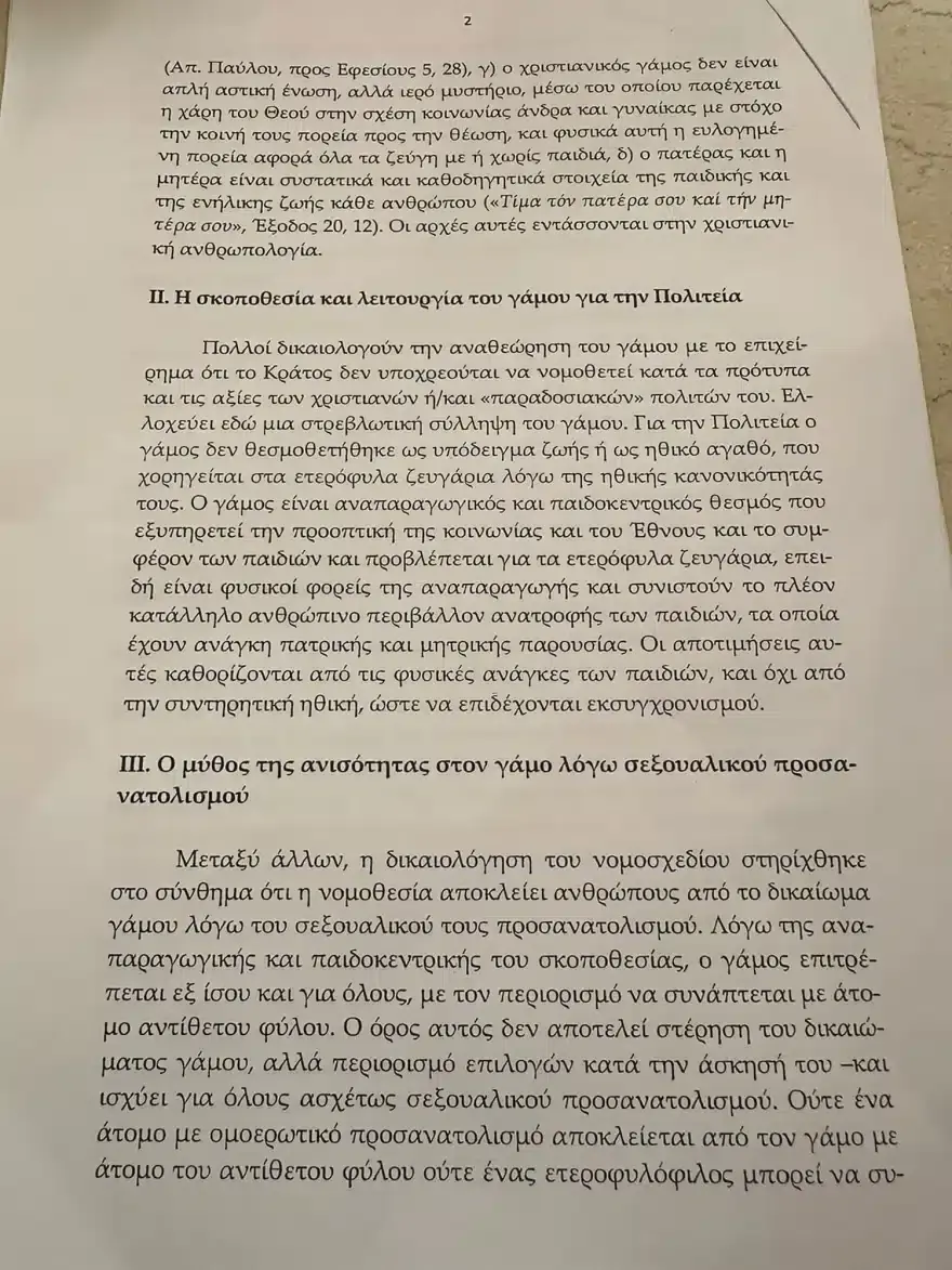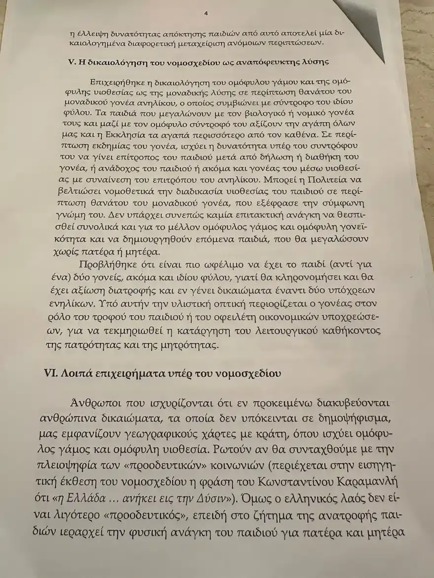 “Είναι γεγονός, το οποίο απασχολεί σύσσωμη την ελληνική κοινωνία, ότι εντός ολίγων ημερών επίκειται να κατατεθεί στη Βουλή των Ελλήνων νομοσχέδιο που θα επιτρέπει τον γάμο ζευγαριών του ιδίου φύλου και θα δίνει το πράσινο φως σε αυτά για τεκνοθεσία. Ασφαλώς, η Ελλάδα, ως κράτος, είναι δυνατόν να προβαίνει σε νομοθετήματα που αντιβαίνουν τους θρησκευτικούς κανόνες.