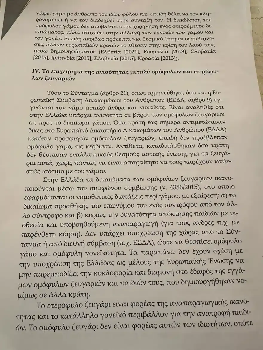 “Είμαστε αναγκασμένοι να πούμε ότι τέτοιου είδους νομοθετήματα δεν ανταποκρίνονται σε ανάγκες και αγωνίες της ελληνικής κοινωνίας, όπως ενδεικτικά είναι το δημογραφικό πρόβλημα και η υπογεννητικότητα που ταλανίζουν τον τόπο μας, αλλά αποτελούν απομιμήσεις πρακτικών κάποιων άλλων κοινωνιών, οι οποίες τα τελευταία χρόνια προβαίνουν σε τέτοιου είδους νομοθετικές ρυθμίσεις, στηριζόμενες σε αυθαίρετες εννοιολογικές κατασκευές περί προτεραιότητας του λεγόμενου κοινωνικού φύλου (Gender) έναντι του βιολογικού, έχοντας χάσει πραγματικά κάθε μέτρο και όριο, όπως θα έλεγε και ο λαός μας”, επισημαίνεται, μεταξύ άλλων.