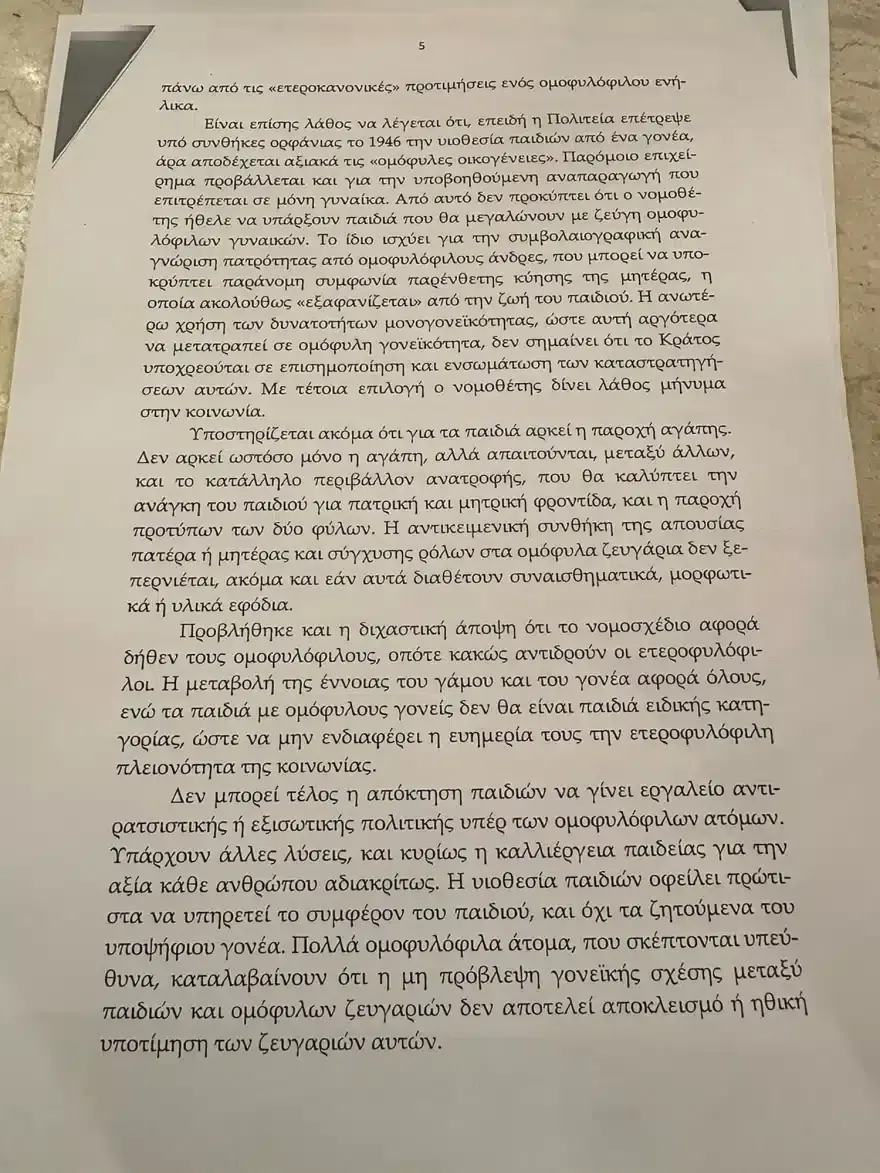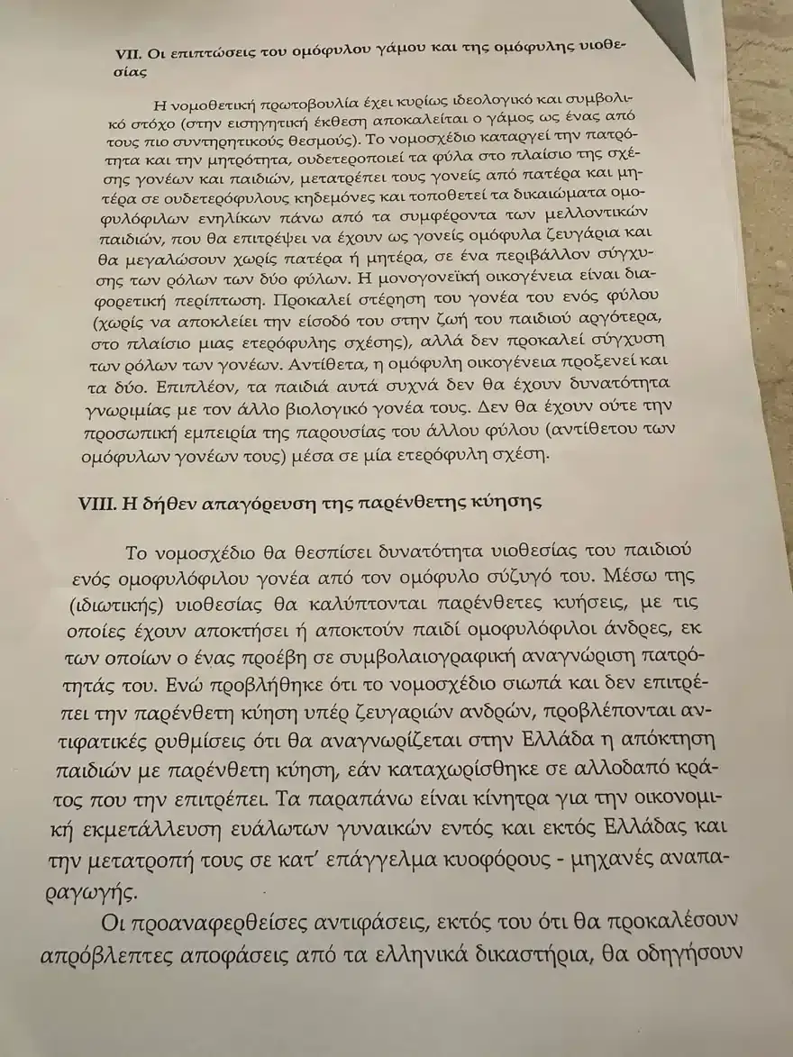 Μεταξύ άλλων επισημαίνει πως: « το νομοσχέδιο καταργεί την πατρότητα και τη μητρότητα, ουδετεροποιεί τα φύλα στο πλαίσιο της σχέσης γονέων και παιδιών, μετατρέπει τους γονείς από πατέρα και μητέρα σε ουδετερόφιλους κηδόμενες και τοποθετεί τα δικαιώματα ομοφυλόφιλων ενηλίκων πάνω από τα συμφέροντα των μελλοντικών παιδιών, που θα επιτρέψει να έχουν ως γονείς ομόφυλα ζευγάρια και θα μεγαλώσουν χωρίς πατέρα ή μητέρα, σε ένα περιβάλλον σύγχυσης των ρόλων των δύο φύλων».