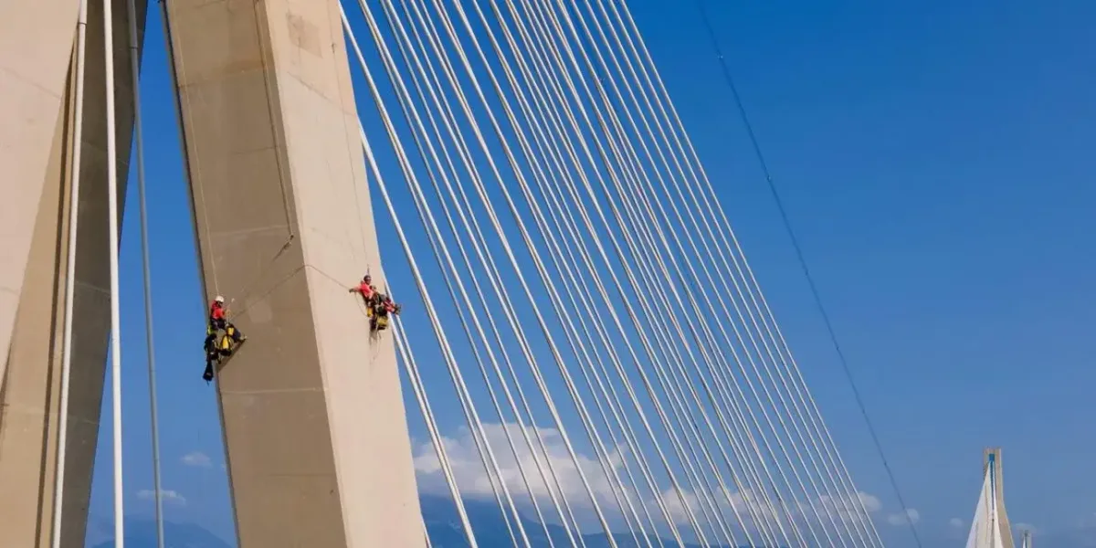 Οι εναερίτες στην γέφυρα Ρίου-Αντιρρίου κρέμονται από τα καλώδια θυμίζοντας ταινία δράσης. Να σημειωθεί πως η δουλειά τους, εκτός από εντυπωσιακή είναι κι άκρως επικίνδυνη, αλλά απολύτως απαραίτητη για την ασφαλή λειτουργία της γέφυρας που ενώνει την Πελοπόννησο με τη δυτική ηπειρωτική Ελλάδα.