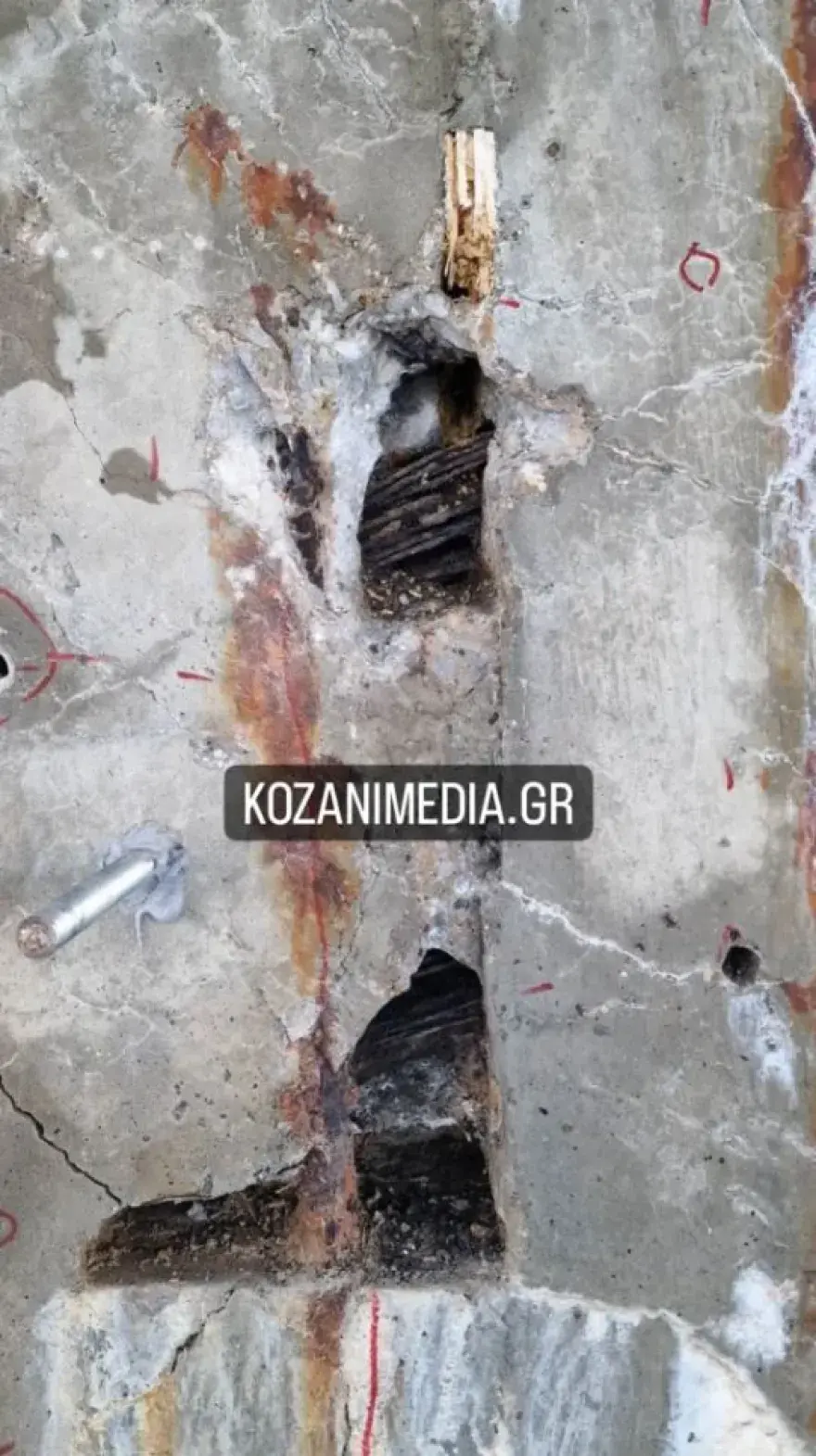 Ωστόσο, όπως επισημαίνουν ειδικοί και μηχανικοί με τους οποίους επικοινώνησε το Kozanimedia, τα εξωτερικά λεπτά σίδερα δείχνουν να είναι σε σχετικά καλή κατάσταση, ενώ υπογραμμίζουν πως πιθανόν ο κόκκινος σωλήνας που εξέχει να ευθύνεται για την οξείδωση στο σημείο, λόγω εκροής υδάτων.