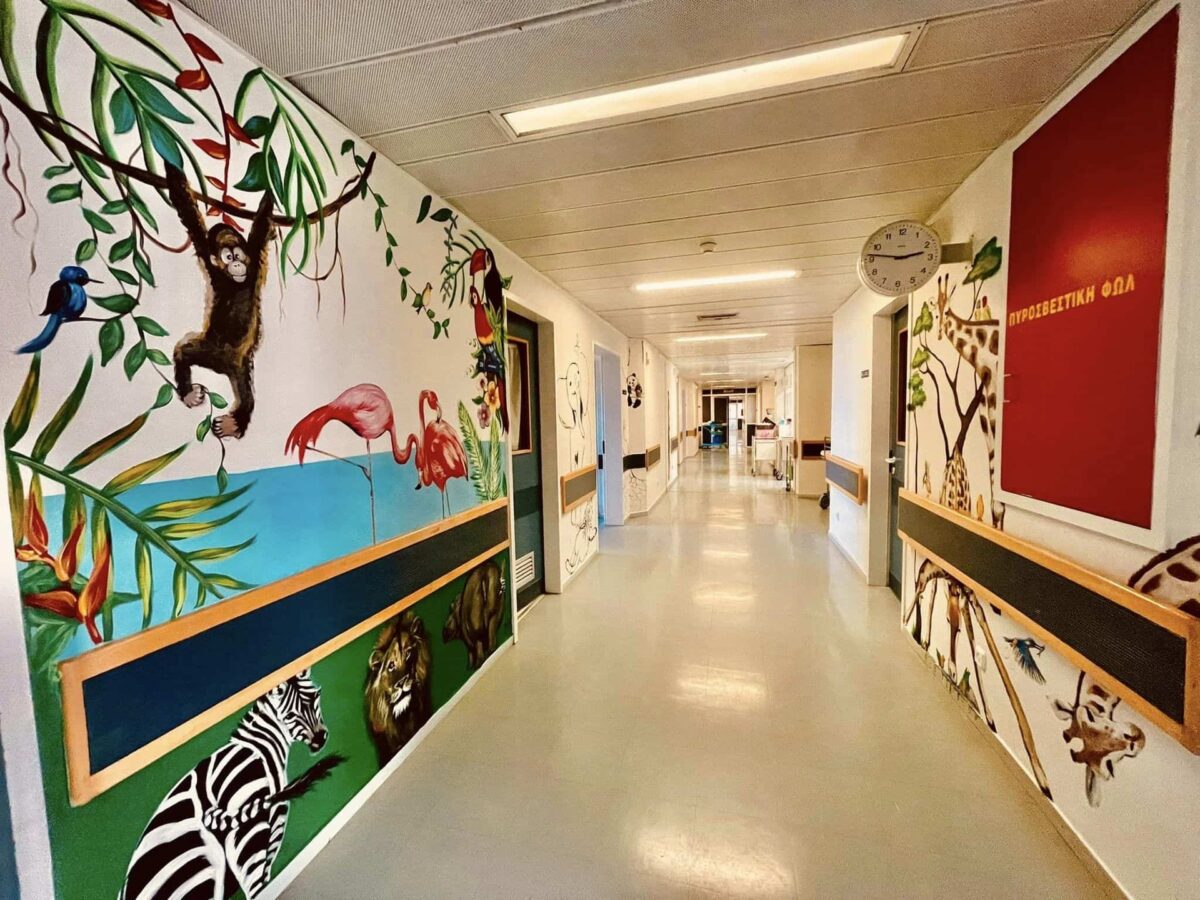 Τους τελευταίους μήνες, οι λευκοί και ψυχροί τοίχοι στους διαδρόμους, τους θαλάμους νοσηλείας και τον παιδότοπο της κλινικής έχουν μεταμορφωθεί σε ζωγραφικούς πίνακες γεμάτους χρώμα, φαντασία και αγαπημένους παιδικούς ήρωες.