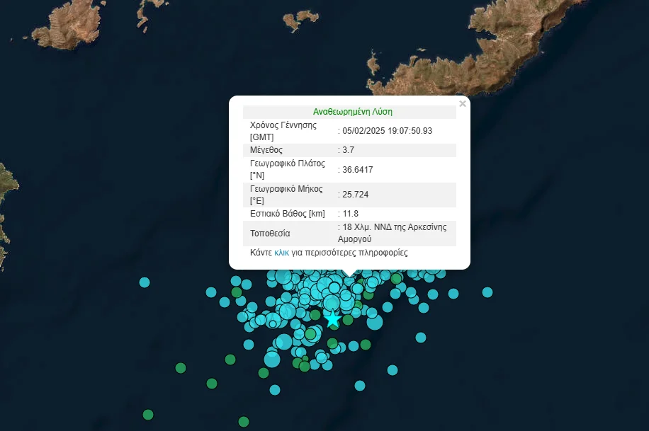 Σύμφωνα με τη νέα εκτίμηση, το επίκεντρο του σεισμού μεταφέρθηκε στα 18 χιλιόμετρα νότια, νοτιοδυτικά της Αρκεσίνης Αμοργού, με εστιακό βάθος 11,8χλμ.