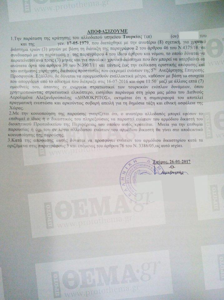 Δείτε το έγγραφο-ντοκουμέντο με το οποίο οι 8 Τούρκοι θα παραμείνουν κρατούμενοι για τους επόμενους τρεις μήνες: