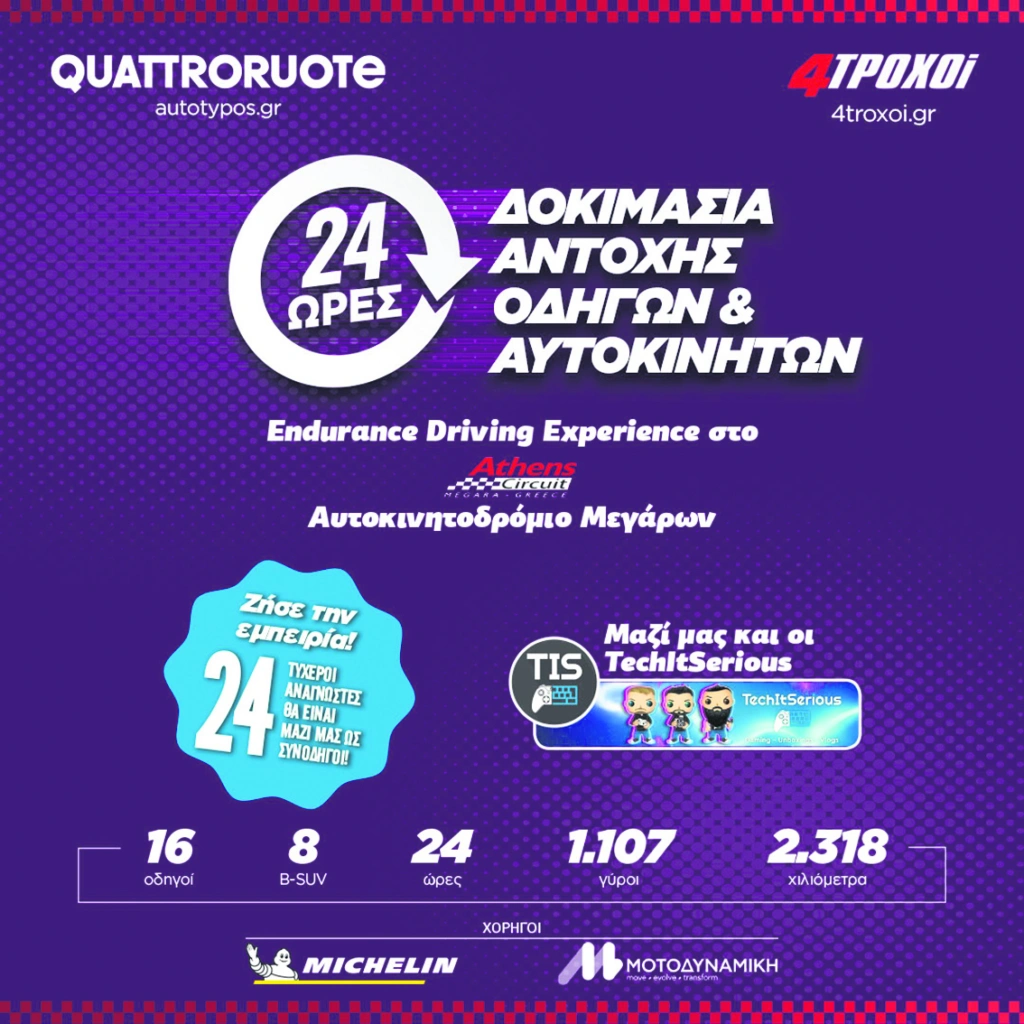 Για 24 ώρες θα παραμείνουν πιεζόμενα εντός πίστας, με εναλλαγή στα ζευγάρια των οδηγών, προκειμένου να διαπιστωθεί η αντοχή τους σε ένα οδηγικό σενάριο που θα αναδείξει τις αρετές αλλά και τα χαρακτηριστικά τους. Χορηγοί της εκδήλωσης είναι η MOTOΔΥΝΑΜΙΚΗ Α.Ε., η Shell, αναλαμβάνοντας τα καύσιμα, η Michelin τα ελαστικά, το Camper Club με αυτοκινούμενα τροχόσπιτα για την ξεκούραση των οδηγών, ενώ το ΕΚΑΕ, το τμήμα εργομετρικών μετρήσεων του ΟΑΚΑ, θα παρακολουθεί συνεχώς τους οδηγούς, εξάγοντας πολύτιμα συμπεράσματα σε ό,τι αφορά τη φυσιολογία τους, την κόπωση και τον χρόνο των αντιδράσεών τους την ημέρα, αλλά και κατά τη διάρκεια της νύχτας.