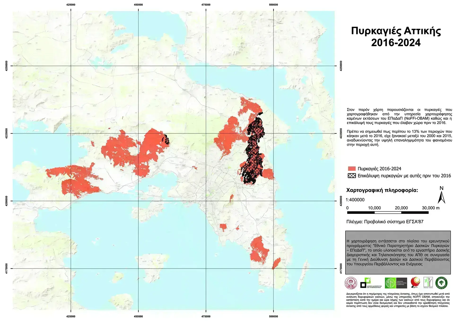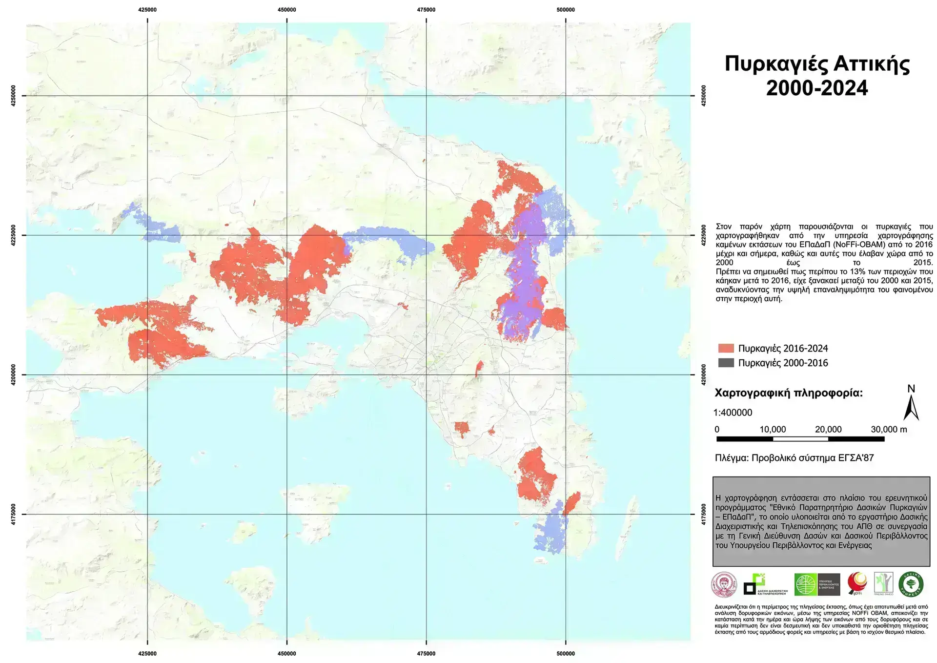 Σύμφωνα με την έρευνα των στελεχών του Εργαστηρίου, περίπου το 13% των περιοχών της Αττικής που κάηκαν μετά το 2016 είχε ξανακαεί μεταξύ 2000 και 2015!