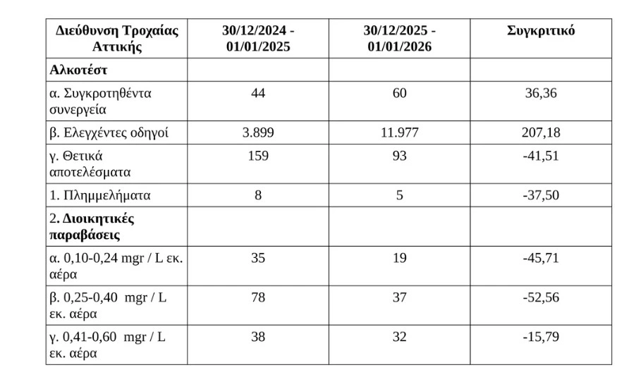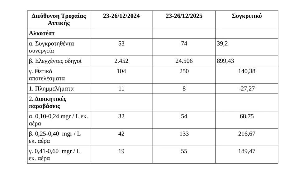 - το διάστημα 23-26/12/2025 το ποσοστό των οδηγών που εντοπίστηκαν να οδηγούν ενώ είχαν καταναλώσει αλκοόλ ήταν 1,02%, είχε μειωθεί δηλαδή κατά 3,22%.