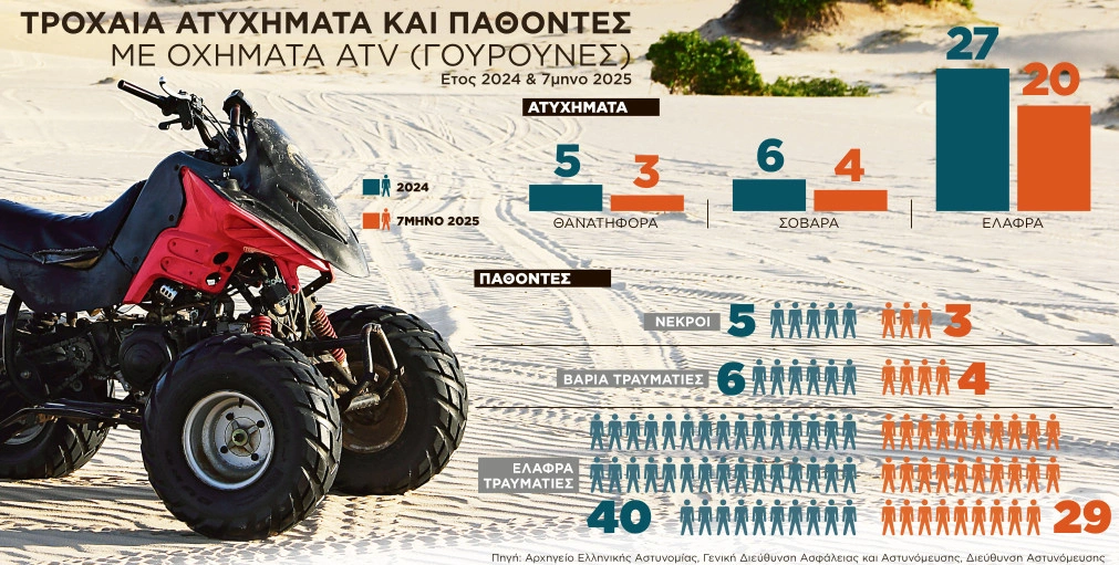 Μόνο στο πρώτο 7μηνο του έτους έχουν σημειωθεί συνολικά 27 τροχαία, εκ των οποίων τα 3 θανατηφόρα, τα 4 σοβαρά και τα υπόλοιπα ελαφρά. Ο έως τώρα απολογισμός, δηλαδή, δείχνει 3 νεκρούς, 4 βαριά τραυματίες και 29 ανθρώπους που τραυματίστηκαν ελαφρά. Το 2024 έχασαν τη ζωή τους 5 άνθρωποι και τραυματίστηκαν 46, εκ των οποίων οι 6 βαριά.