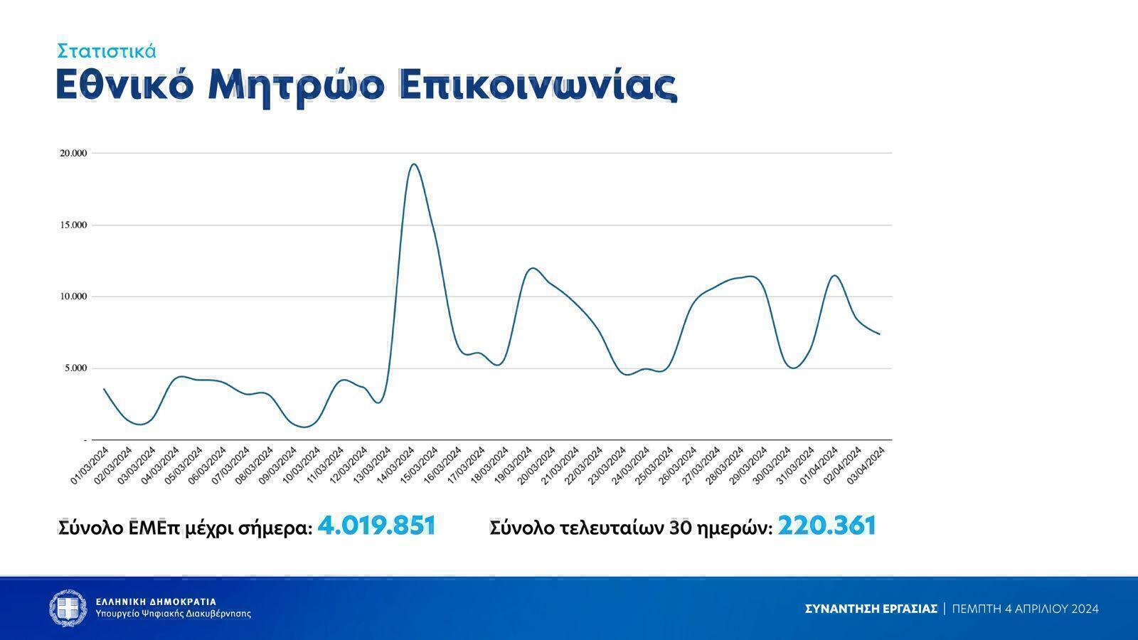 Μέχρι αυτήν την στιγμή, τα στοιχεία δείχνουν ότι τις τελευταίες 30 ημέρες καταχώρισαν τα στοιχεία τους 220.361 άτομα, ενώ από την πρώτη στιγμή που ξεκίνησε το ΕΜΕπ να λειτουργεί παραγωγικά τον Μάρτιο του 2021 και έως σήμερα, έχουν ολοκληρώσει την εγγραφή τους 4.019.851 πολίτες.