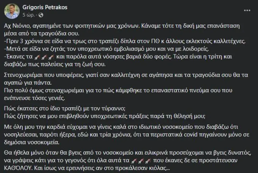 Επίσης σχολιάζει με ειρωνικό τρόπο το γεγονός ότι ο Διονύσης Σαββόπουλος νοσηλεύτηκε σε ιδιωτικό νοσοκομείο, ενώ σύμφωνα με τον Γρηγόρη Πετράκο «ήξερα, εδώ και τρία χρόνια, ότι τα περιστατικά covid πηγαίνουν μόνο σε δημόσια νοσοκομεία», με το παραλήρημά του να μην σταματά εκεί: «Θα ήθελα μόνο όταν θα βγεις από το νοσοκομείο και ειλικρινά προσεύχομαι να βγεις δυνατός, να γράψεις κάτι για το γεγονός ότι όλα αυτά τα εμβόλια που έκανες δε σε προστάτευσαν ΚΑΘΌΛΟΥ».