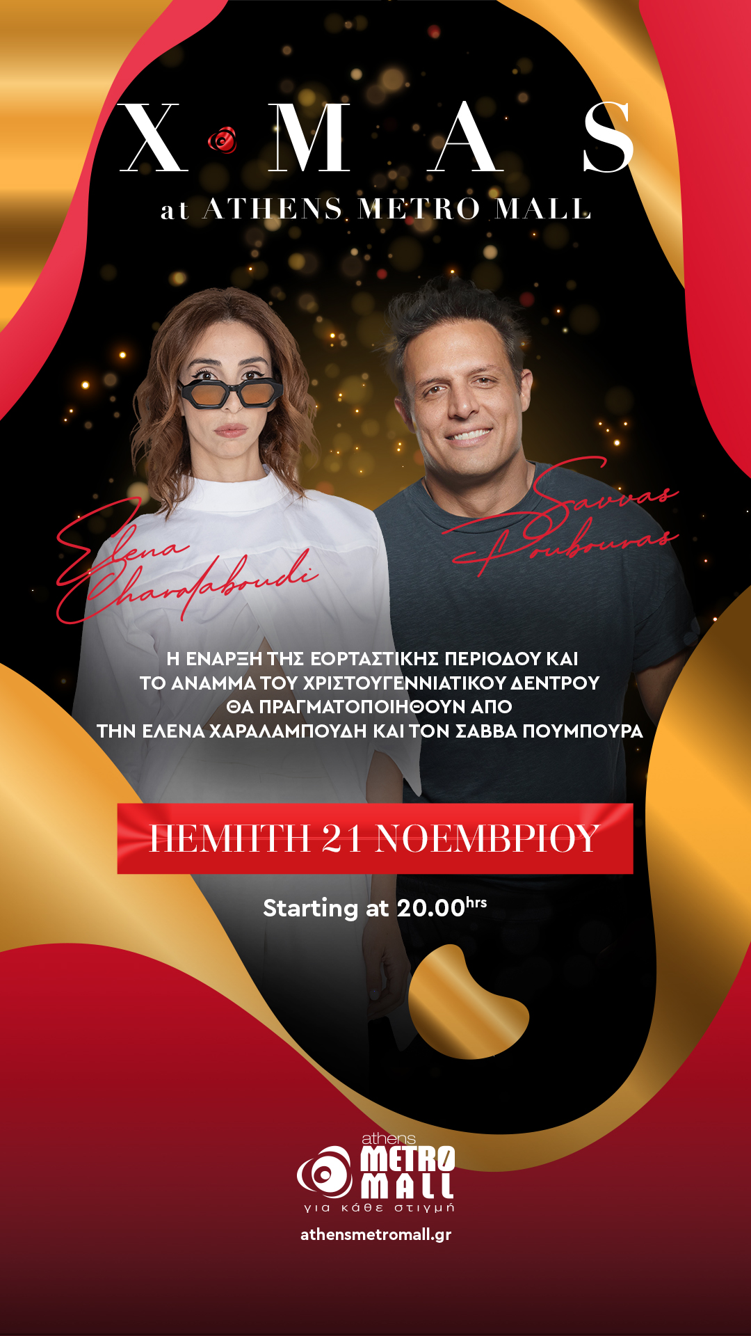 Τους αγαπάτε & φέτος δίνετε μαζί τους το σήμα για την έναρξη των γιορτών! Η Έλενα Χαραλαμπούδη – aka 5 Minute Mum – και ο αγαπημένος σας Σάββας Πούμπουρας «αναλαμβάνουν» τη φωταγώγιση του εντυπωσιακού χριστουγεννιάτικου δέντρου του ATHENS METRO MALL και σας περιμένουν για το πιο εορταστικό countdown.