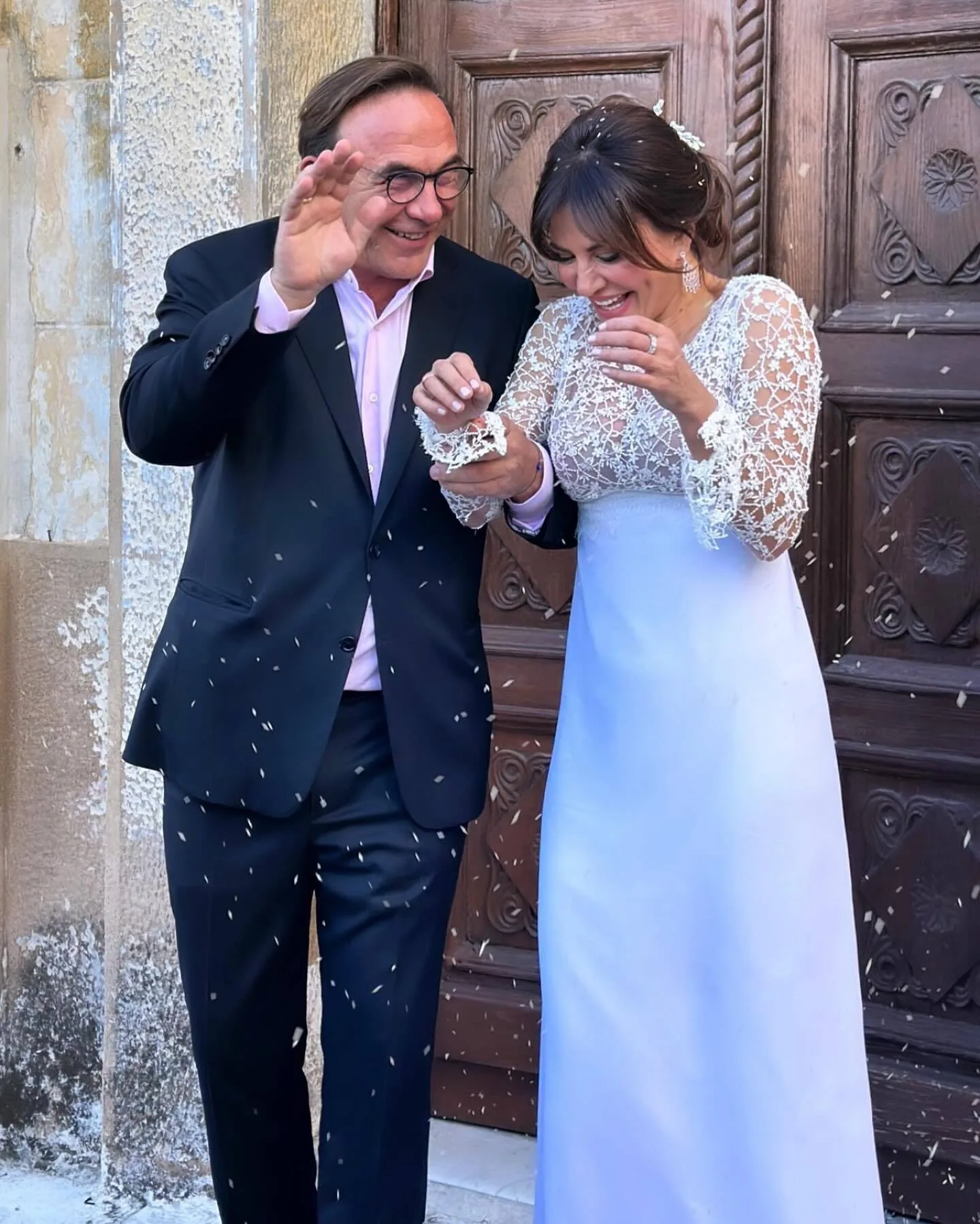 Παρουσία συγγενών και ελάχιστων φίλων, που δεν ξεπερνούσαν στον αριθμό τους 60, το ζευγάρι έζησε την πιο ωραία του κοινή στιγμή με τη Δήμητρα Ματσούκα να εμφανίζεται υπέρλαμπρη μέσα σε ένα ρομαντικό νυφικό με δαντέλα.
