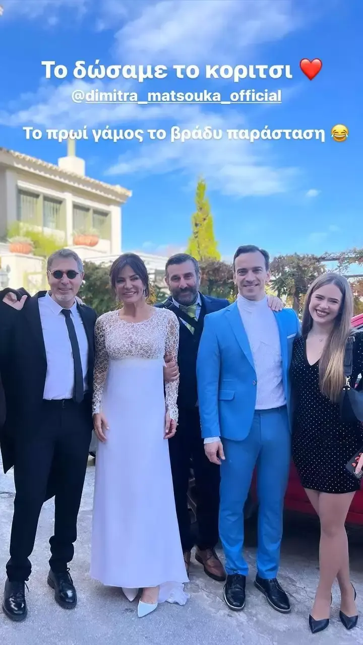Ανάμεσα στους καλεσμένους του ζευγαριού ήταν και οι ηθοποιοί της παράστασης που συμμετέχει η Δήμητρα Ματσούκα, «Μαθήματα Κωμωδίας», η οποία ανεβαίνει στο Μικρό Παλλάς. Μάλιστα, οι συνάδελφοί της Θοδωρής Αθερίδης, Ηλίας Βαλάσης, Δημήτρης Σαμόλης και Αναστασία Τσιλιμπίου, φωτογραφήθηκαν με τη λαμπερή και τρισευτυχισμένη νύφη, ενώ σχετικά στιγμιότυπα ανέβηκαν και στα social media.