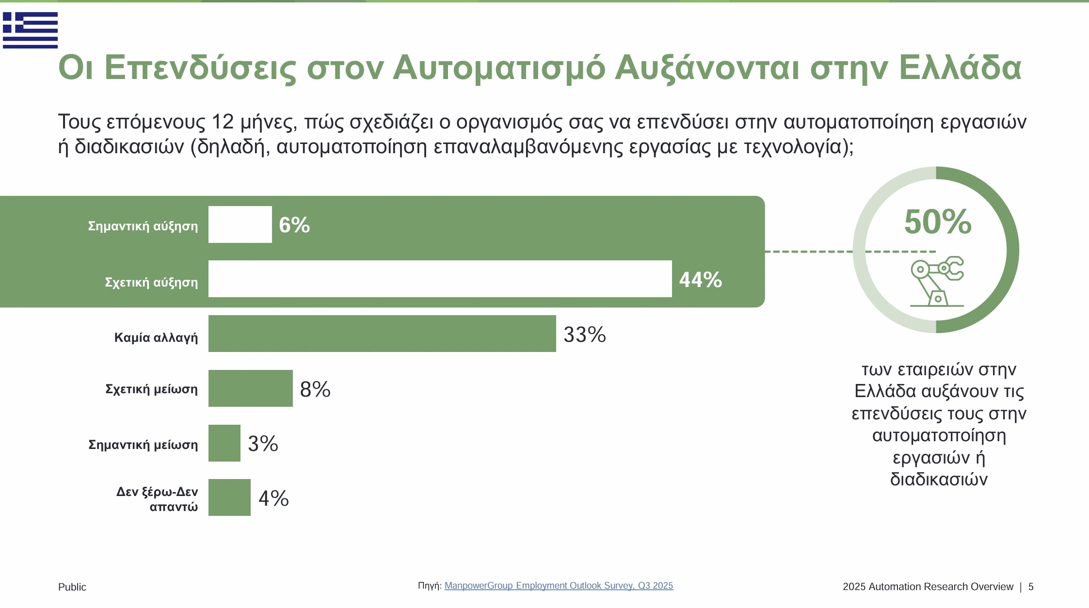 Σύμφωνα με τη νέα διεθνή έρευνα της ManpowerGroup με τίτλο «Making Industrial and Software Automation Full Partners at Work», το 50% των ελληνικών επιχειρήσεων δηλώνει ότι σκοπεύει να αυξήσει τις επενδύσεις του στην αυτοματοποίηση εργασιών μέσα στους επόμενους δώδεκα μήνες – ποσοστό που φέρνει τη χώρα πολύ κοντά στον παγκόσμιο μέσο όρο (61%).