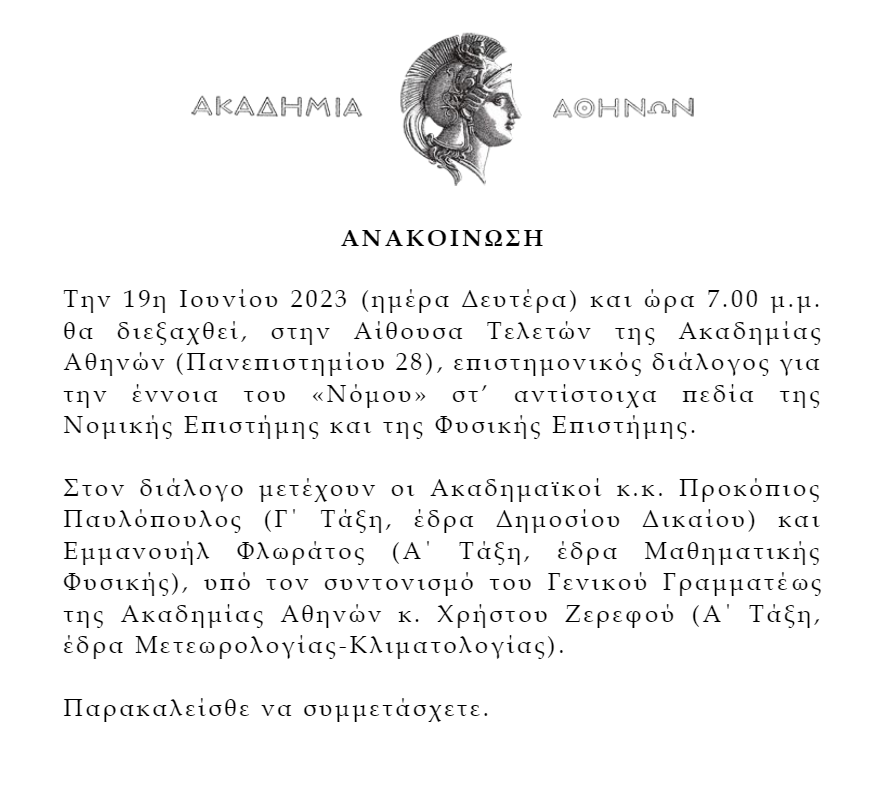 Η σημαντική αυτή εκδήλωση θα πραγματοποιηθεί στις 19 Ιουνίου 2023 στις 19:00 στην Αίθουσα Τελετών της Ακαδημίας Αθηνών και στον διάλογο θα μετέχουν σημαντικές προσωπικότητες, υπό τον συντονισμό του ΓΓ της Ακαδημίας Αθηνών, Χρήστου Ζερεφού.