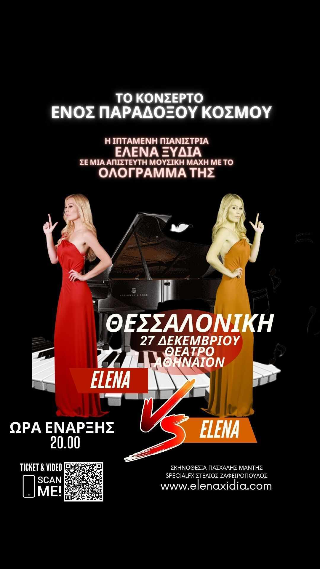 «Πρόκειται για μία μάχη μεταξύ δύο πιάνων, του αληθινού, του live, στο οποίο θα είμαι εγώ πάνω στη σκηνή και στον αντίποδα, απέναντί μου θα υπάρχει ένα ολογραμματικό πιάνο, με μια ολογραμματική Έλενα Ξυδιά» δηλώνει στο Αθηναϊκό/Μακεδονικό Πρακτορείο Ειδήσεων η καλλιτέχνιδα.