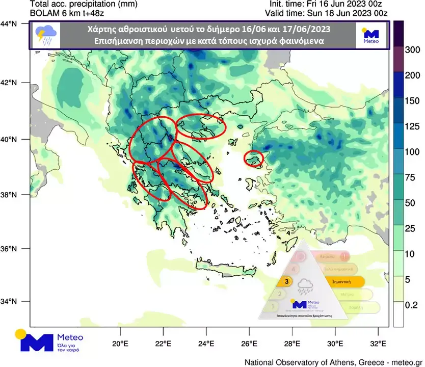 Σύμφωνα με την κατηγοριοποίηση του επεισοδίου βροχόπτωσης (RPI), η οποία εφαρμόζεται από τη μονάδα Meteo του Εθνικού Αστεροσκοπείου Αθηνών, το επεισόδιο βροχόπτωσης για το Σάββατο 17/06 (ημέρα με τα γενικευμένα φαινόμενα) κατατάσσεται στην Κατηγορία 3 (Σημαντική).