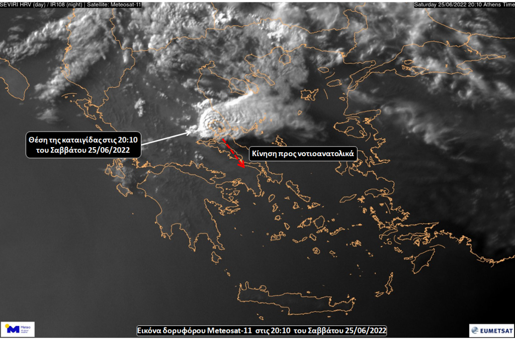 Στην σχετική εικόνα που ελήφθη από τον μετεωρολογικό δορυφόρο Meteosat-11 στις 20:10 το βράδυ του Σαββάτου 25/06 σημειώνεται η καταιγίδα που κινούμενη προς νοτιοανατολικά επηρέασε την περιοχή της Πεντέλης».