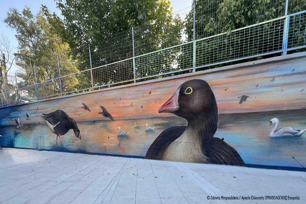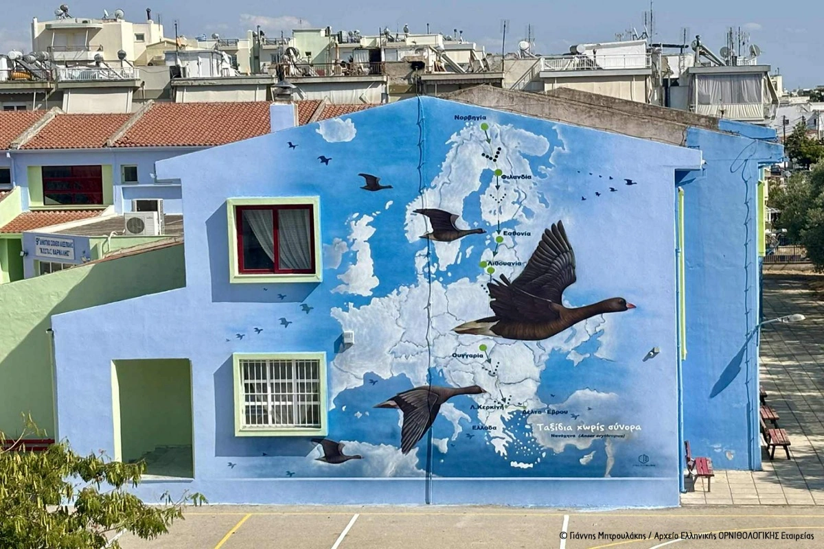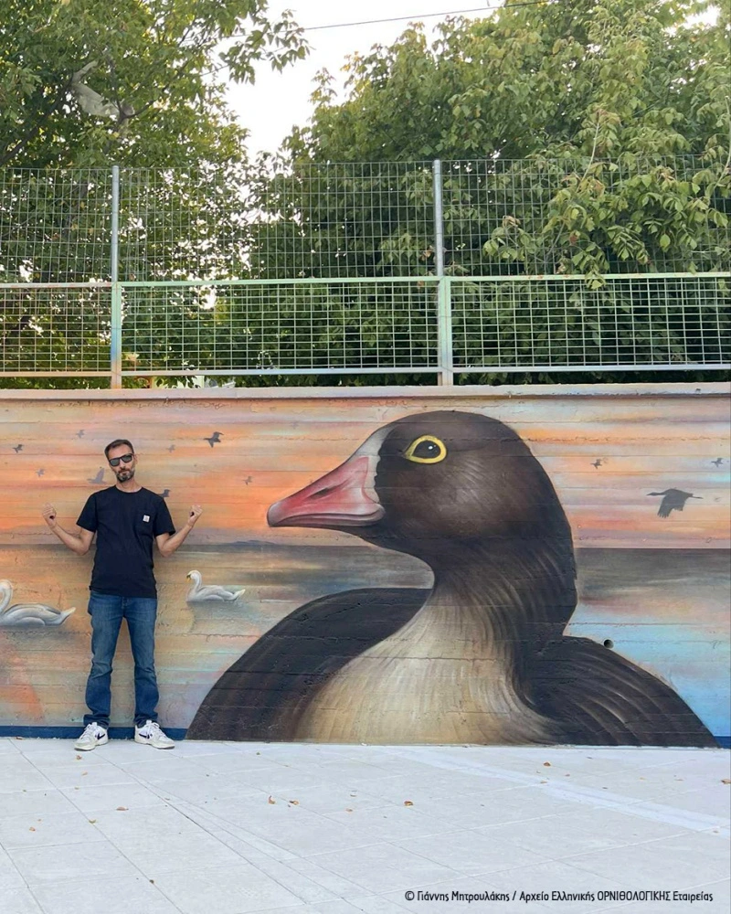 Στο 5ο Νηπιαγωγείο, η τοιχογραφία απεικονίζει ένα χειμωνιάτικο τοπίο του δέλτα του Έβρου, με τη νανόχηνα να δεσπόζει ανάμεσα στα πτηνά της περιοχής. «Το έργο λειτουργεί σαν ένα ζωντανό παράθυρο στη φύση, ενισχύοντας τη σύνδεση των παιδιών με το τοπικό οικοσύστημα», αναφέρει η εικαστική ομάδα «Crew Mitroulakis», που φιλοτέχνησε τις τοιχογραφίες. Στο 9ο Δημοτικό, η νανόχηνα παρουσιάζεται ως σύμβολο ταξιδιού και ελευθερίας, με την τοιχογραφία να αποτυπώνει το εντυπωσιακό μεταναστευτικό της ταξίδι από τον Αρκτικό Κύκλο έως τη Μεσόγειο. «Τα πουλιά δεν γνωρίζουν σύνορα. Η προστασία τους απαιτεί διεθνή συνεργασία», υπογραμμίζει η Ελληνική Ορνιθολογική Εταιρεία, που συντόνισε τη δράση στο πλαίσιο του ευρωπαϊκού προγράμματος LIFE LWfG CLIMATE.