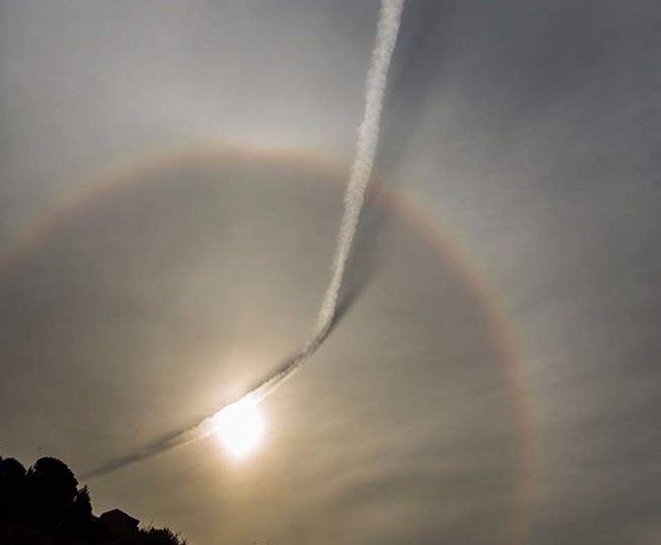 Η ασυνήθιστη κυρτή γραμμή που διασχίζει την εικόνα είναι μια ουρά συμπύκνωσης – ένα είδος σύννεφου που δημιουργείται από τα διερχόμενα αεροπλάνα. Ένα μεγάλο μέρος αυτού του ίχνους θα πρέπει στην πραγματικότητα να βρίσκεται πιο μακριά από ό,τι το λεπτό νέφος, επειδή ρίχνει μια σκιά πάνω στο σύννεφο, δίνοντας μια ασυνήθιστη τρισδιάστατη ποιότητα στην εικόνα».