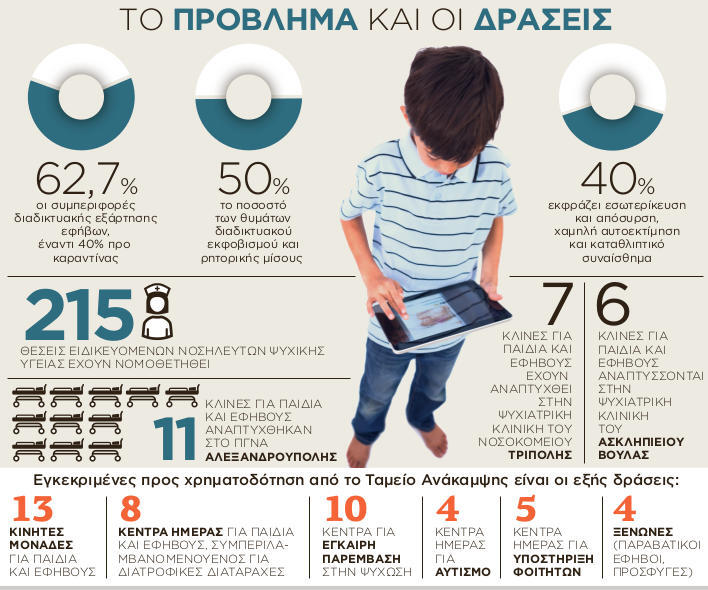 Οπως έχει αναφερθεί και διεθνώς, λόγω των περιοριστικών μέτρων και των lockdowns, τα παιδιά και οι έφηβοι παρουσίασαν συναισθήματα ανασφάλειας, αίσθημα απώλειας, καθημερινό άγχος που εκφράστηκαν με έλλειμμα προοπτικής και αισιοδοξίας. Εξαιτίας των πρωτόγνωρων και ψυχοπιεστικών συνθηκών, έχει καταγραφεί σημαντική αύξηση της διαδικτυακής εξάρτησης στα παιδιά και τους εφήβους. Σύμφωνα με μελέτες του ΕΚΠΑ, οι συμπεριφορές διαδικτυακής εξάρτησης φτάνουν το 62,7% στον εφηβικό πληθυσμό, έναντι 40% προ καραντίνας, με περίπου 20% να εκδηλώνει σοβαρή παραίτηση από καθημερινές υποχρεώσεις και δραστηριότητες.