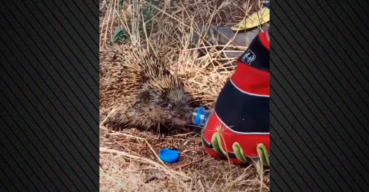 Στη διάρκεια της επιχείρησης και αφού η φωτιά έχει σβήσει ο πυροσβέστης βρίσκει έναν σκαντζόχοιρο μέσα στη καμένη έκταση και φροντίζει να τον κρατήσει ζωντανό δίνοντας του να πιεί νερό.