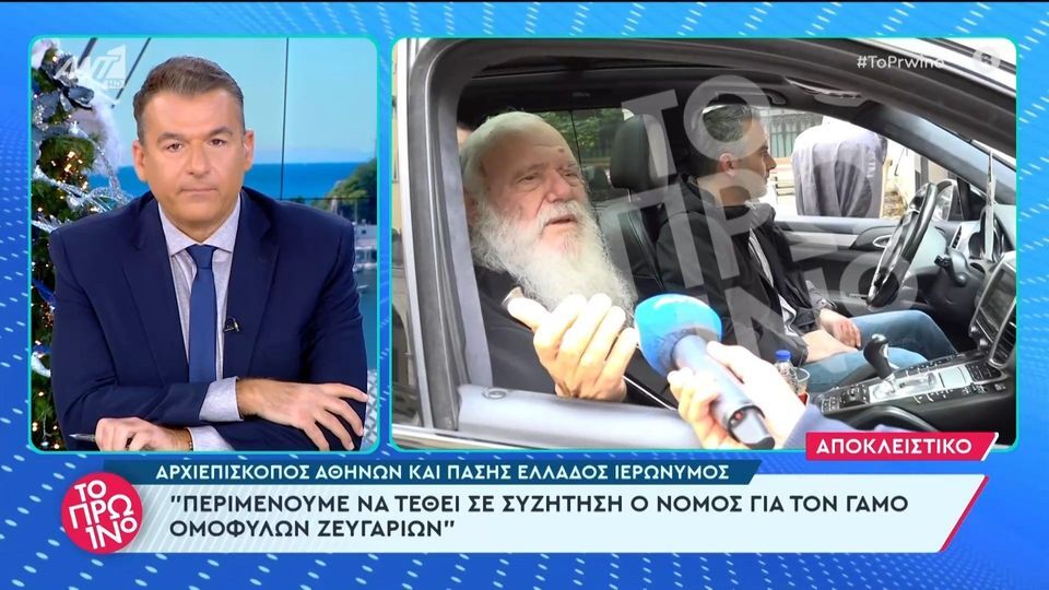 Ο δημοσιογράφος από το Πρωινό του ΑΝΤ1, Γιάννης Μαλλιαρός, συνάντησε τον Αρχιεπίσκοπο Ιερώνυμο, εξερχόμενο από τη συνεδρίαση της Ιεράς Συνόδου και με αφορμή τη συζήτηση για το νομοσχέδιο για τον γάμο των ομόφυλων ζευγαριών, ακολούθησε ένας ασυνήθιστος διάλογος ανάμεσα τους.