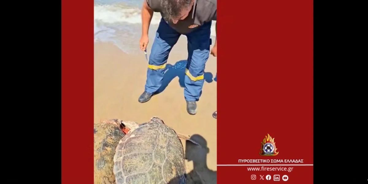 Με την καθοδήγηση του Συλλόγου Προστασίας Θαλάσσιας Χελώνας «ΑΡΧΕΛΩΝ», οι πυροσβέστες προχώρησαν στην κοπή των διχτυών που κρατούσαν τις θαλάσσιες χελώνες παγιδευμένες και κατάφεραν να τις απελευθερώσουν.