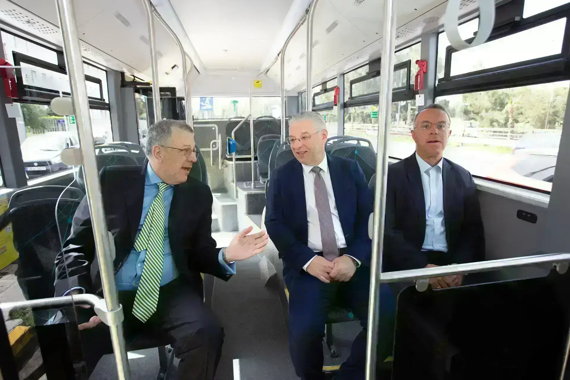 Στο πρώτο δοκιμαστικό δρομολόγιο στο κέντρο της Αθήνας, επιβιβάστηκαν (στην λεωφόρο Συγγρού) ακολουθώντας ένα τμήμα της διαδρομής του, ο υπουργός Υποδομών και Μεταφορών Χρήστος Σταϊκούρας, ο υφυπουργός Υποδομών και Μεταφορών Νίκος Ταχιάος και ο διευθύνων σύμβουλος της ΟΣΥ ΑΕ Στέφανος Αγιάσογλου.