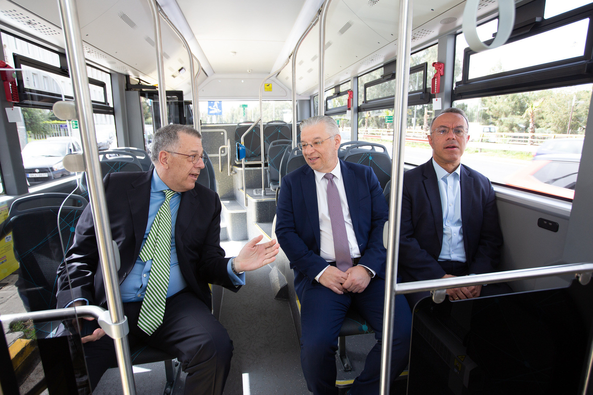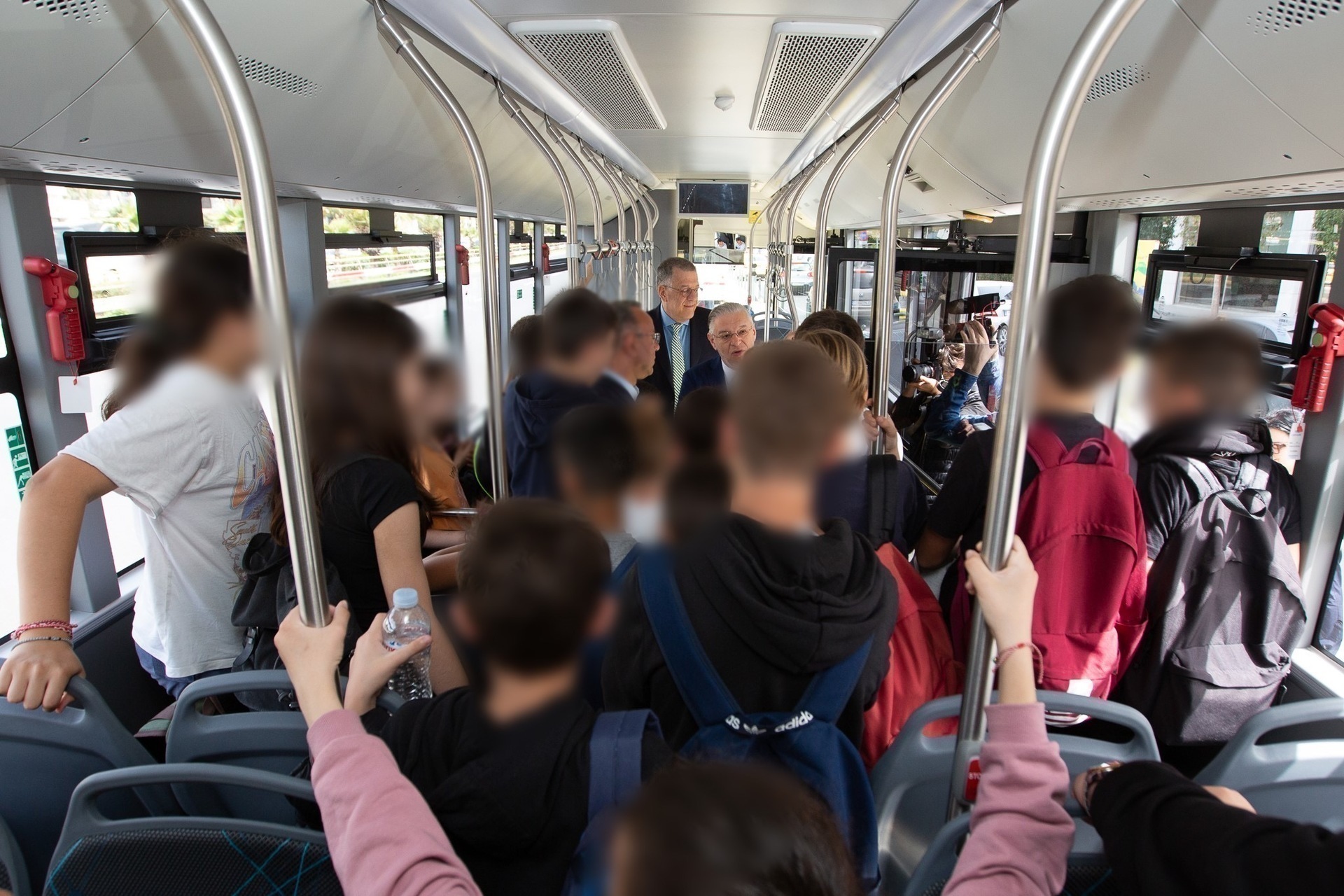 Το υπερσύγχρονο λεωφορείο, σύμφωνα με ανακοίνωση της ΟΣΥ, τράβηξε το ενδιαφέρον των μαθητών Δημοτικού σχολείου, οι οποίοι περνούσαν από τη στάση και ουσιαστικά αποτέλεσαν τους πρώτους επιβάτες.