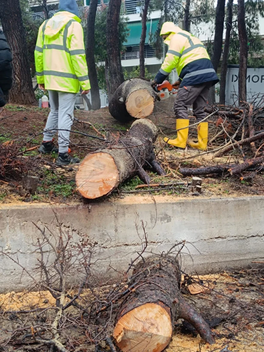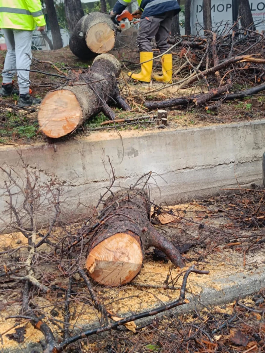 Στην περιοχή βρέθηκαν συνεργεία του δήμου για να απομακρύνουν τα σπασμένα κλαδιά και το αυτοκίνητο που υπέστη ζημιές.