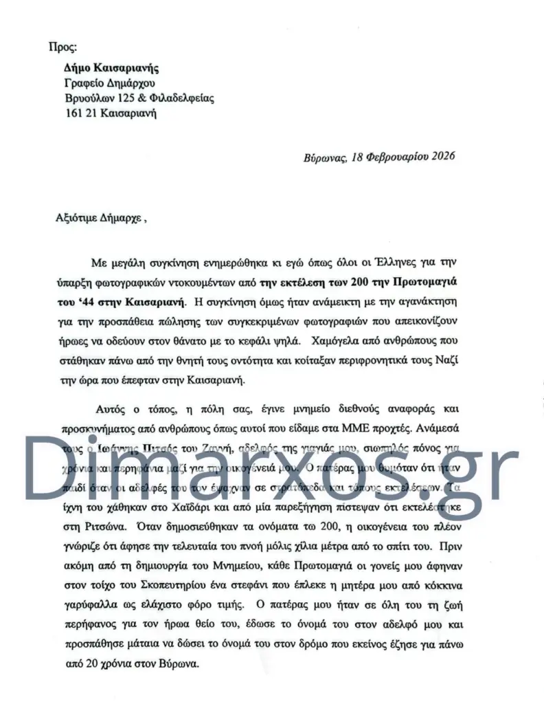 Παρουσία του Δημάρχου Καισαριανής Ηλία Σταμέλου και του προέδρου του Δημοτικού Συμβουλίου Νικόδημου Κατσαρέλη, η Κατερίνα Μ. Πετρή ανηψιά του Ιωάννη Πιτσού, ενός εκ των 200 εκτελεσμένων κομμουνιστών, εργαζόμενη στον Δήμο Καισαριανής, παρέδωσε επιστολή της οικογένειας, καθώς και το εκλογικό βιβλιάριο του θείου της.